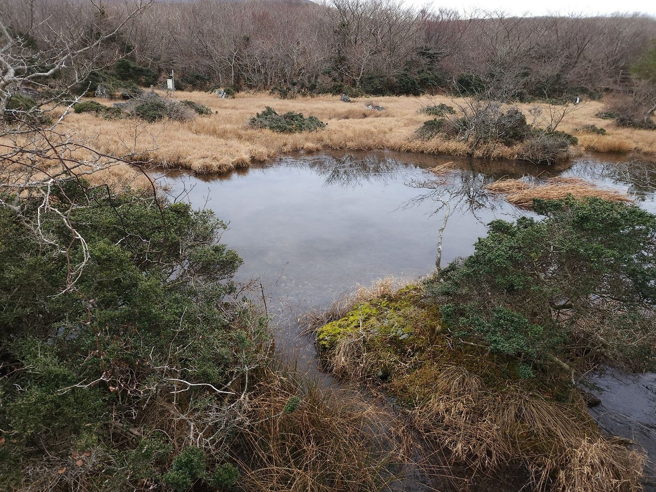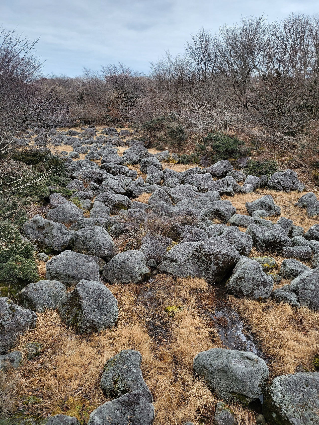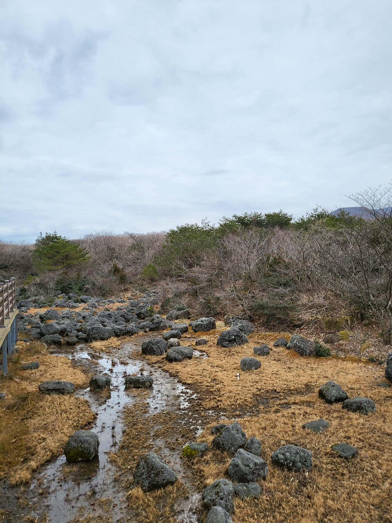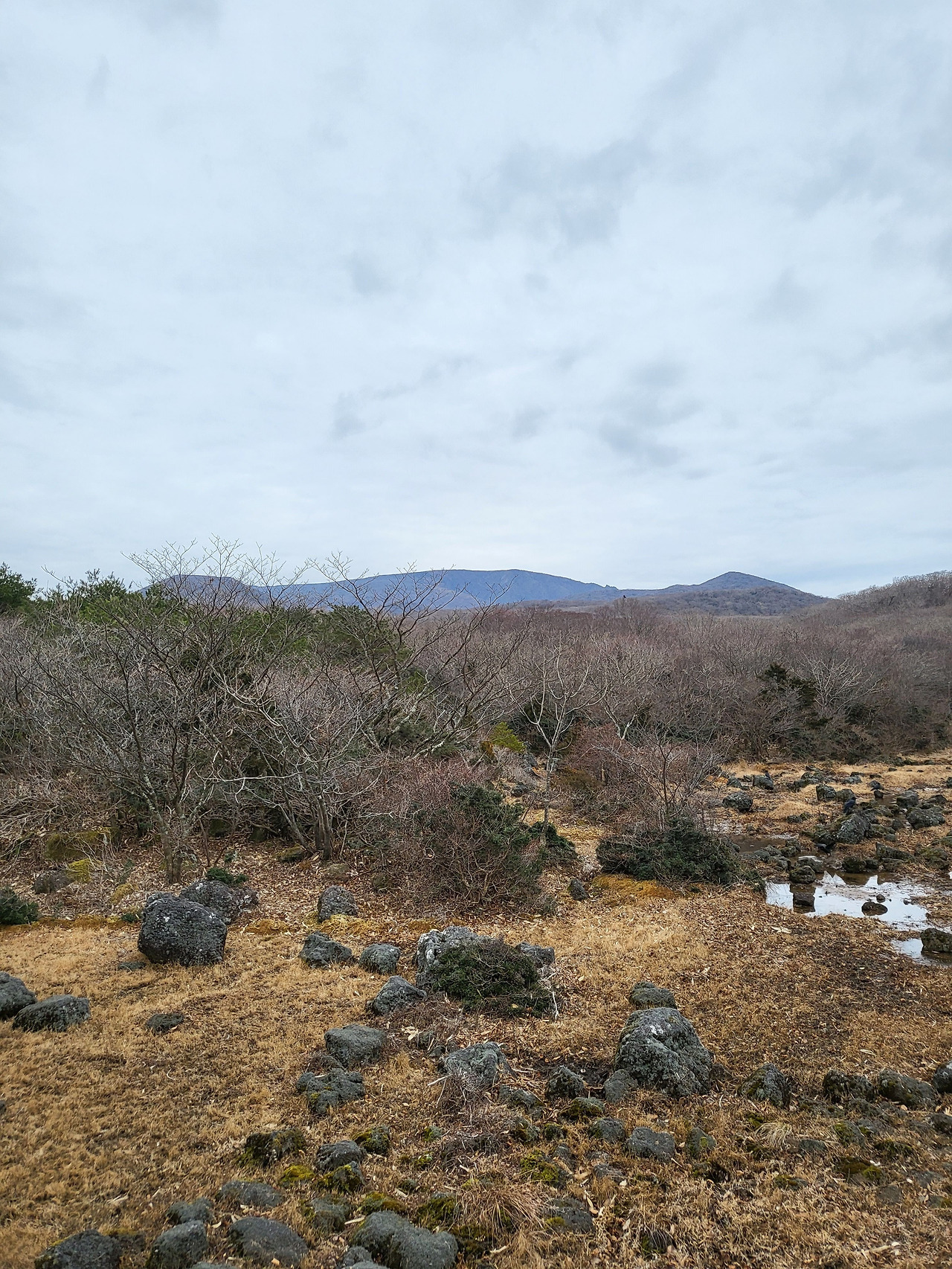 낮 기온이 15도까지 오른다고 일기예보를 보고는 왔지만 여기에 오니 서늘하니 찬기운이 감돌기만 했다. 추웠다. 오전 10시쯤에 도착한 1100 고지 습지다. 고요하고 서늘하게 한라산을 올려다보았다. 습지도 잠든 것처럼 멈춰져 있었다. 큰 까마귀 떼가 무리 지어 있었다. 화산암이 제주를 말하는 듯했고, 습지 내 웅덩이 끝이 얼어있었다. 우리는 오래 있지 않고 짧게 둘러보고 떠났다.