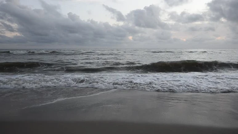 짙은 회색빛 파도의 물결이 모래 위에.... 만조의 바다, 그 색조는 검다기보다는 회색에 가까웠다.