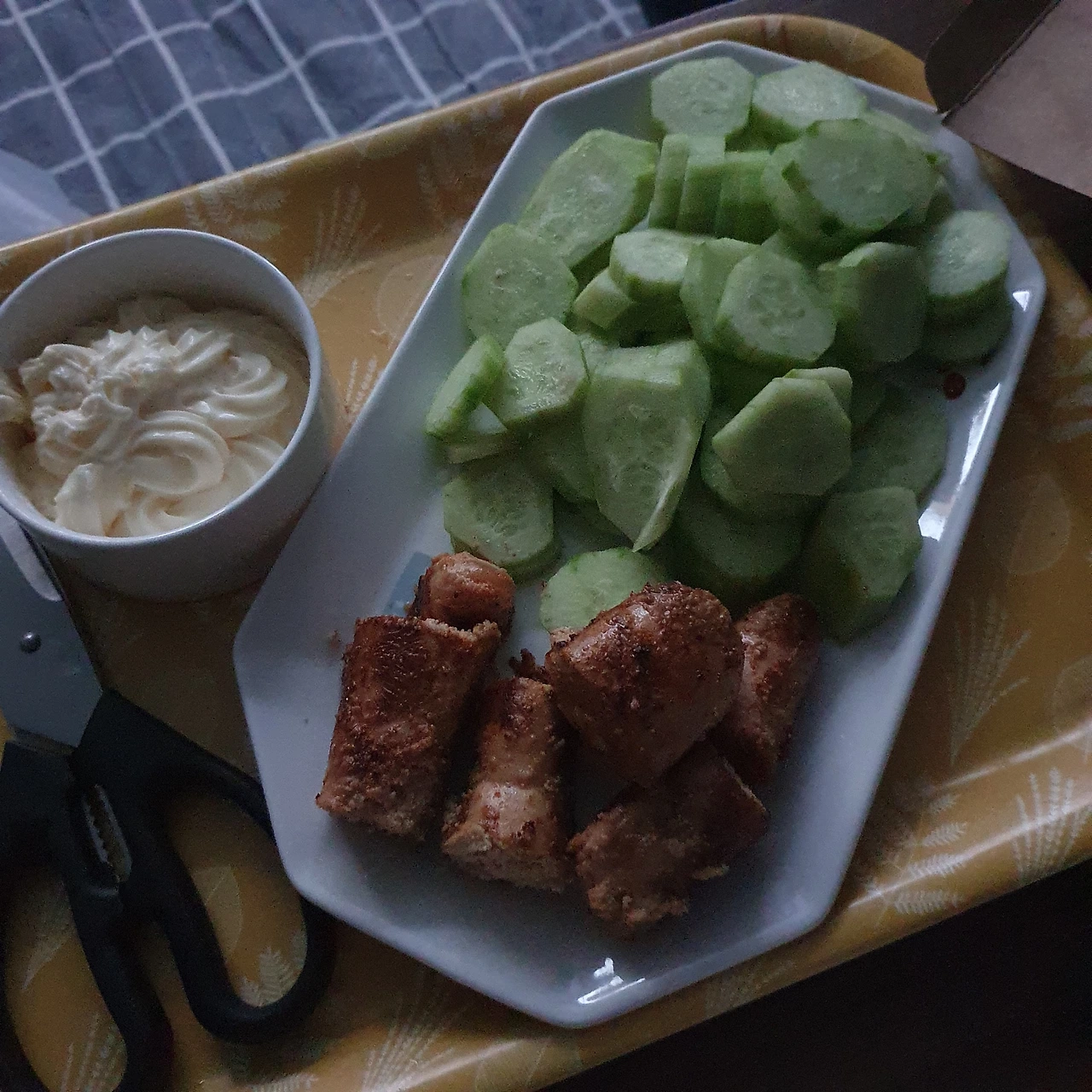 연어 + 새우튀김 + 집에 있는 화요 + 토닉워터 + 맥주 마지막 한 캔 + 소주 마니 막 한병
