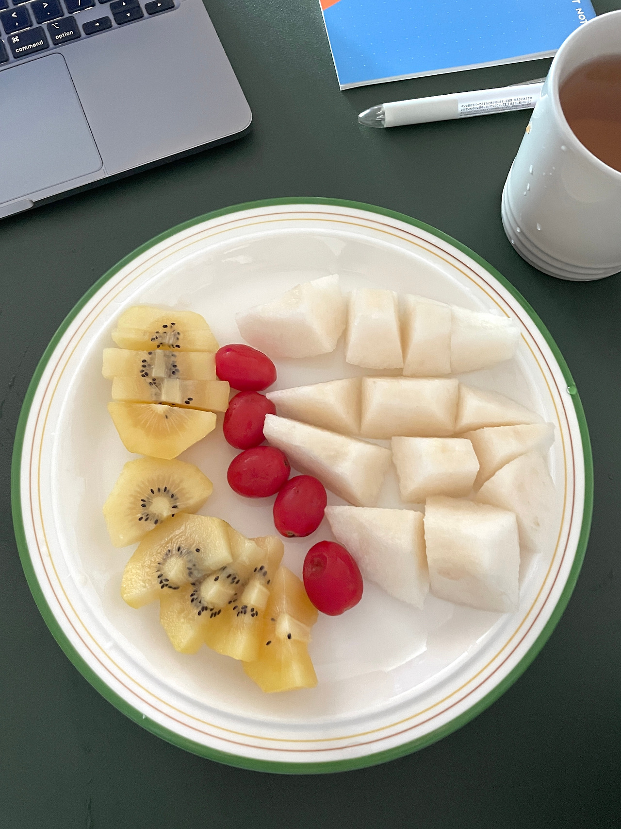 조용한 아침에 쏟아내는 글을 쓰며, 가득 과일을 쌓아놓고 먹으니 오늘은 정말 오늘의 양을 다 할 수 있을 거 같다. 이렇게 주문을 건다.