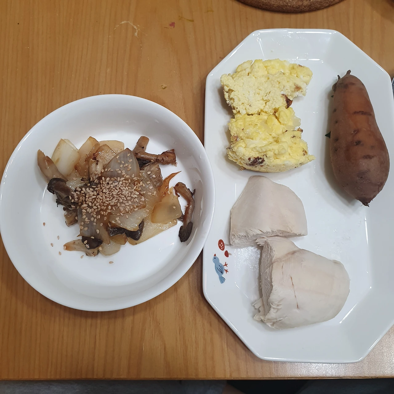 저녁 닭가슴살은 반개 먹고 고구마는 먹지 못함