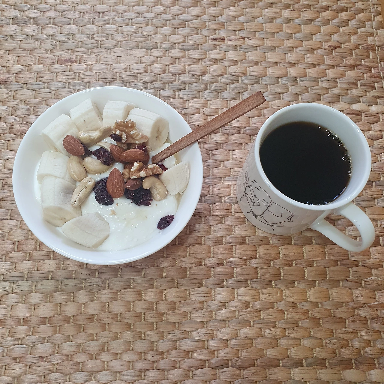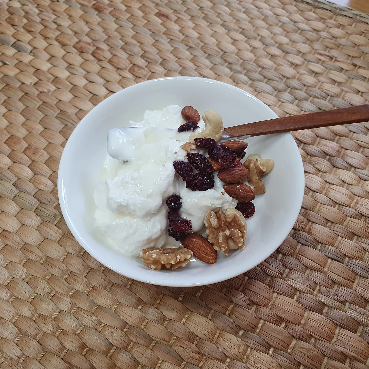 만든 그릭요거트에 한 끼 견과류를 뿌려 먹었다