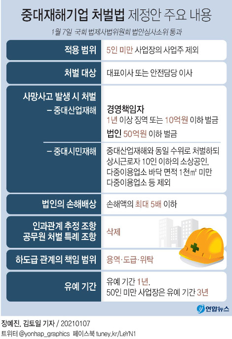 바로 '중대재해기업처벌법'이다. 그저 제 자리에서 최선을 다해 일했을 뿐인데 미비한 안전장치 때문에 스러져 간 사람들, 그들의 죽음이 헛되지 않도록 그리고 또 다른 희생양을 만들지 않도록 사회가 안전을 강제하도록 한 법이다. 하지만 원안과 달리 처벌 대상과 범위, 처벌 수준, 적용 시기 등이 입법취지를 살리지 못했다며 노동계는 크게 반발하고 있다. 반면 재계는 세계적으로 유례를 찾아 볼 수 없는 과잉입법이라고 불합리함을 주장하고 있다.