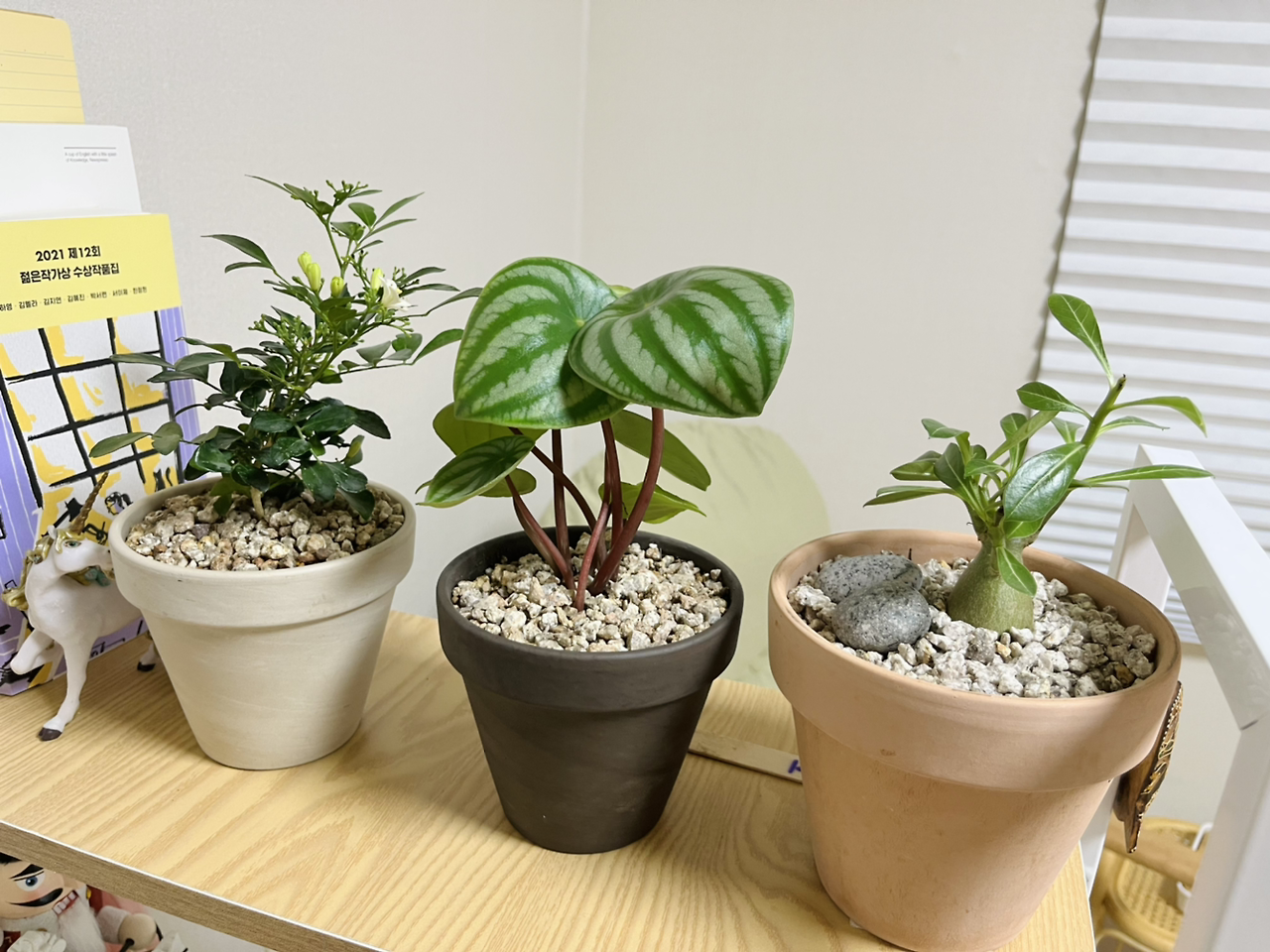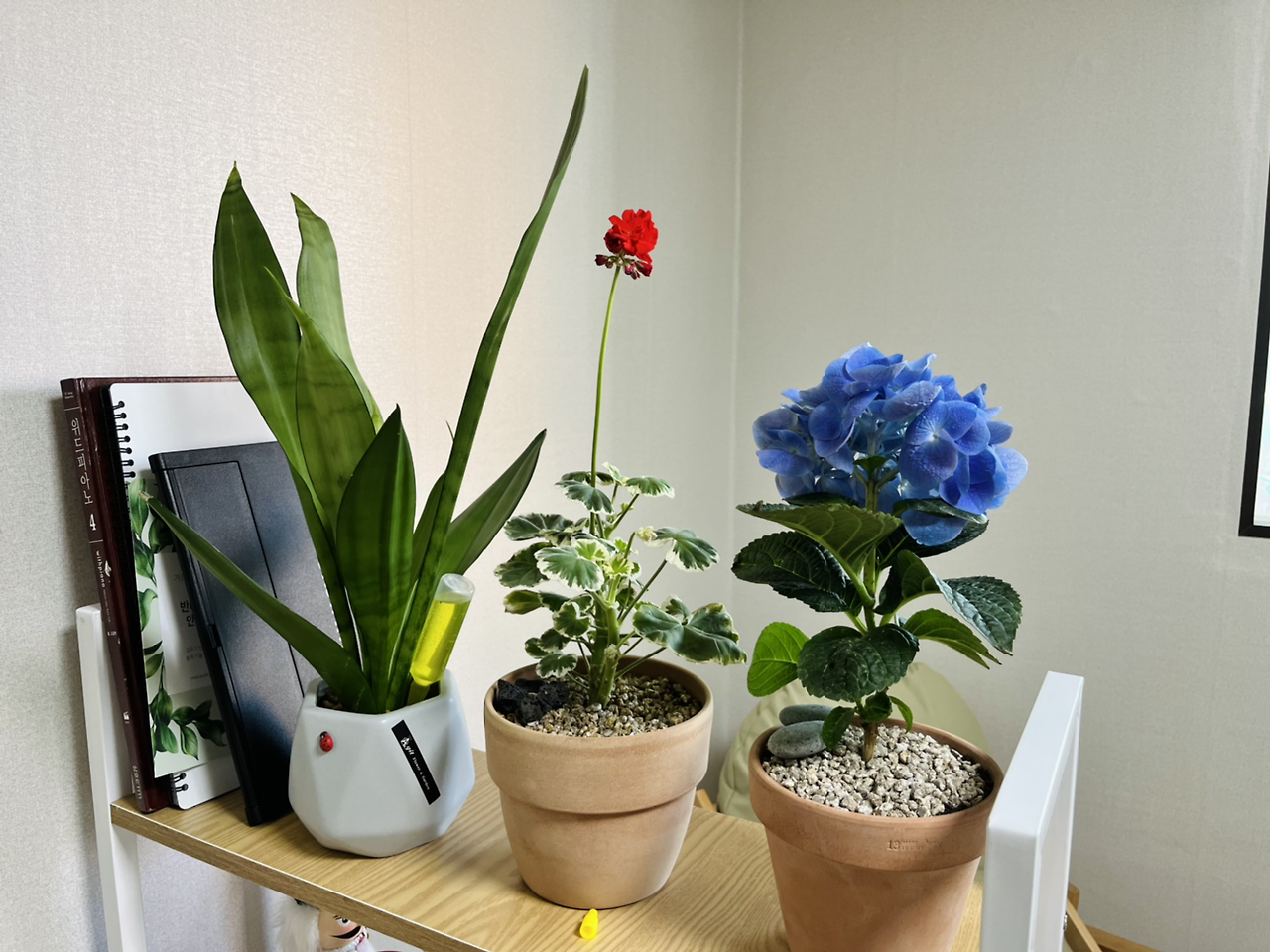 이번 년도에는 식물 키우기에 도전하고 있는데 현재는 총 다섯 종류의 화분을 키우고 있다. 이게 다 2019년도부터 기특하게 잘 크고 있는 산세베리아 덕분이다. 산세베리아를 보며 다른 것들도 키워야겠다는 마음을 먹은 까닭이다. 하지만 또 죽이기부터 시작됐다. 먼저 샀던 제라늄과 수국, 은행목은 모두 죽었다. 수국은 죽은 꽃잎을 너무 떼어냈던 게 사인인 것 같고 제라늄과 은행목은 더울까봐 물을 자주 준 바람에 과습으로 뿌리가 썩었다.