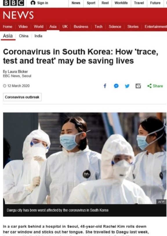 한국을 코로나 19 대응 모범사례로 보도하는 외신