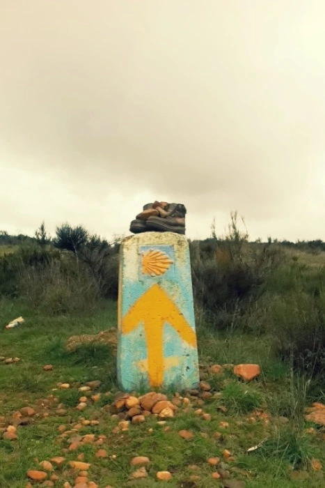 산티아고로 가는 이정표인 노란 화살표와 순례자의 낡은 신발 한 켤레.