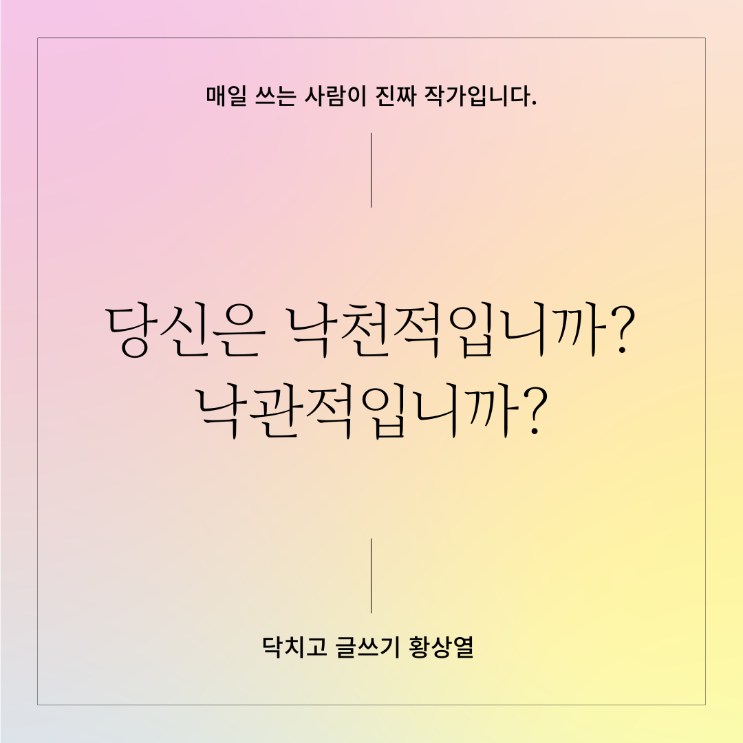 어떤 사람은 낙천적이라 하고, 또 다른 사람은 낙관적인 성격을 가지고 있다. 자세히 보면 두 가지는 다르다. 낙천적인 것은 아주 해맑다는 뜻과 비슷하다. 아무 생각없이 인생을 사는 일이다. 이유 없이 안일하게 사는 태도는 좋지 않다. 그래도 자신 인생에서 어떤 방향은 있어야 하지 않겠는가? 미래에 벌어질 일에 대해 아무런 대비도 하지 않고 흘러가는대로 몸을 맡긴다는 것 자체가 무모한 짓이다.
