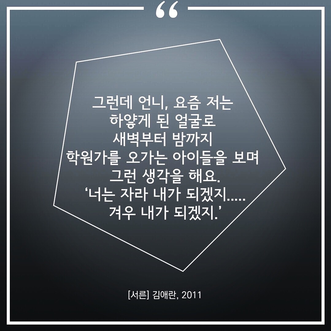 김애란 작가의 이 문장을 발견하기 전에도 이런 생각을 꽤 했었습니다. 특히 버스를 타고 학교 앞을 지나가면서 학생들을 바라보다 보면 절로 이런 생각을 하게 됩니다. 삶의 윤회라는 걸 개인 수준이 아니라 사회 수준으로 바라보면 어떨까 생각했습니다. 그러면 자연스럽게 여기저기서 태어나고 자라고 있는 또 다른 나를 찾을 수 있게 됩니다. 그런 생각을 이렇게 명료하게 문장으로 옮기는 것... 그것이 작가의 몫 아닌가 싶습니다. 그리고 그런 문장들을 찾아내는 건 독자의 몫이겠지요.
