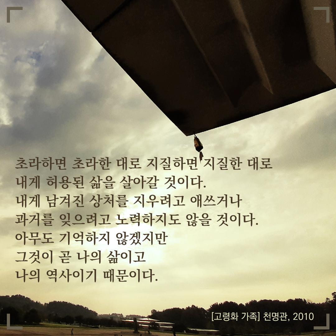 오늘의 하이라이트. 코믹 찬란한 [고령화 가족]의 엔딩이 이렇게 폼나는 것인지는 이제야 알았습니다. 낄낄대며 썩소를 짓던 기억만 났는데, 다시 읽어 보니 이건 멋짐 폭발의 샤방한 느낌이어서 왠지 천명관 작가스럽지 않은 기분마저 듭니다. '삶의 도서관'에서도 밝혔듯이 이런 마음이 기초가 되어서, 선택된 역사가 아닌 모두의 삶이 흐르는 역사를 상상해 봅니다.