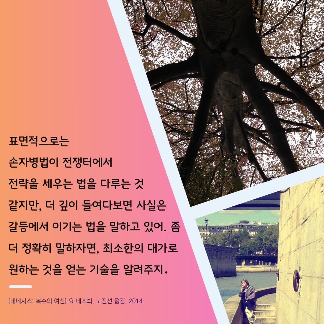 '강들에서 이기는 법'이라는 신선한 그리고 그럴듯한 해석이 마음에 들었습니다. 이어지는 대사에서 '여자'의 특성을 말하는 대목이 있는데, 제가 여자는 이렇다, 남자는 저렇다 라는 식으로 규정하는 것을 싫어해서 잘랐습니다. (가끔 술자리에서 그런 식으로 떠는 적은 있었던 것 같은데...) 참고로 예전에 SNS 등에서 성격을 봐주는 앙케트를 하면 저는 남녀 각 50%로 나오더라고요. 서너 번을 반복해야 조금 차이가 나는 경우도 있었는데, 비공식적으로 저는 여자입니다. ㅋ