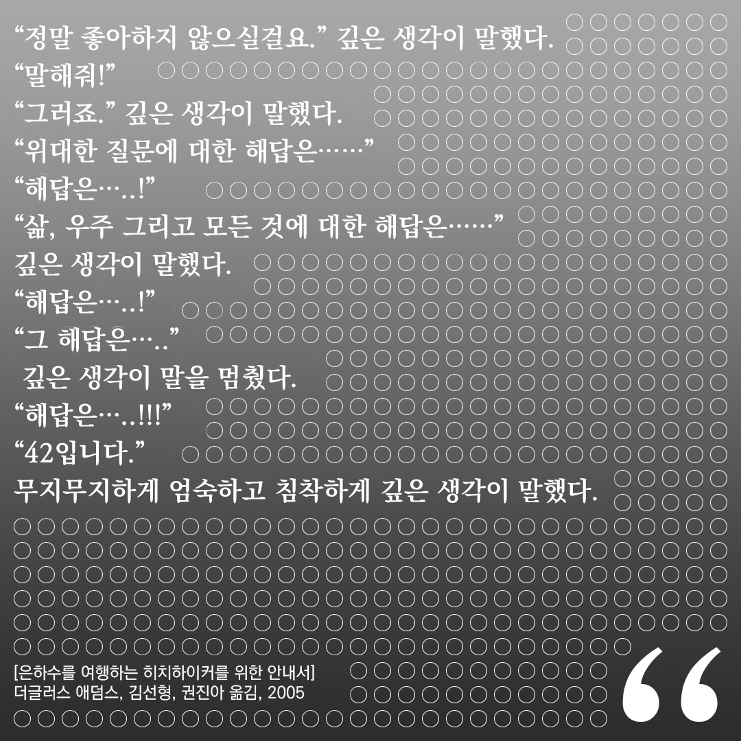 삶, 우주 그리고 모든 것에 대해 '42'가 답이야 라고 말해 버리면 그만입니다. (책에서는 다음 농담이 이어집니다. 그러니까 올바른 답을 구하기 위해 제대로 된 질문을 만들어야 한다는...) 애당초 맞고 틀리고는 부차적인 문제인 거죠. 우리에게는 해답이 있다는 것만으로도 큰 위안이 되는 거니까요.