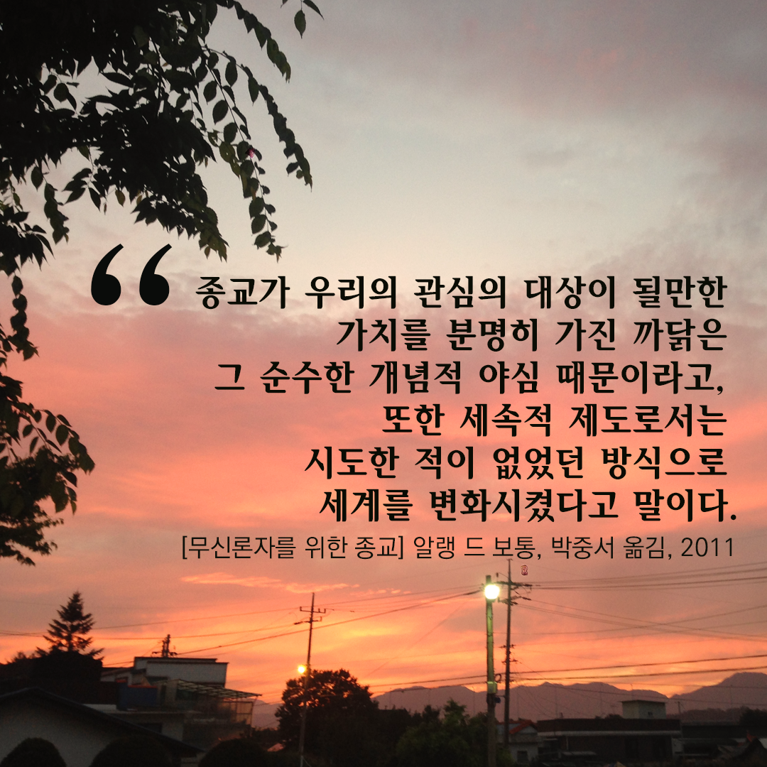 그런데 종교는 좀 다르죠. 언젠가 잡지에서 '학교'에 대한 내용을 읽으면서 그 기원이 종교라는 것을 보고는 좀 충격을 받았습니다. 찾아보니 학교뿐만이 아니었습니다. 약간 과장하면 우리가 일상을 살아가는 세세한 과정들이 종교에 의해서 규정되고 만들어졌다고 생각하면 무서워지기까지 합니다.