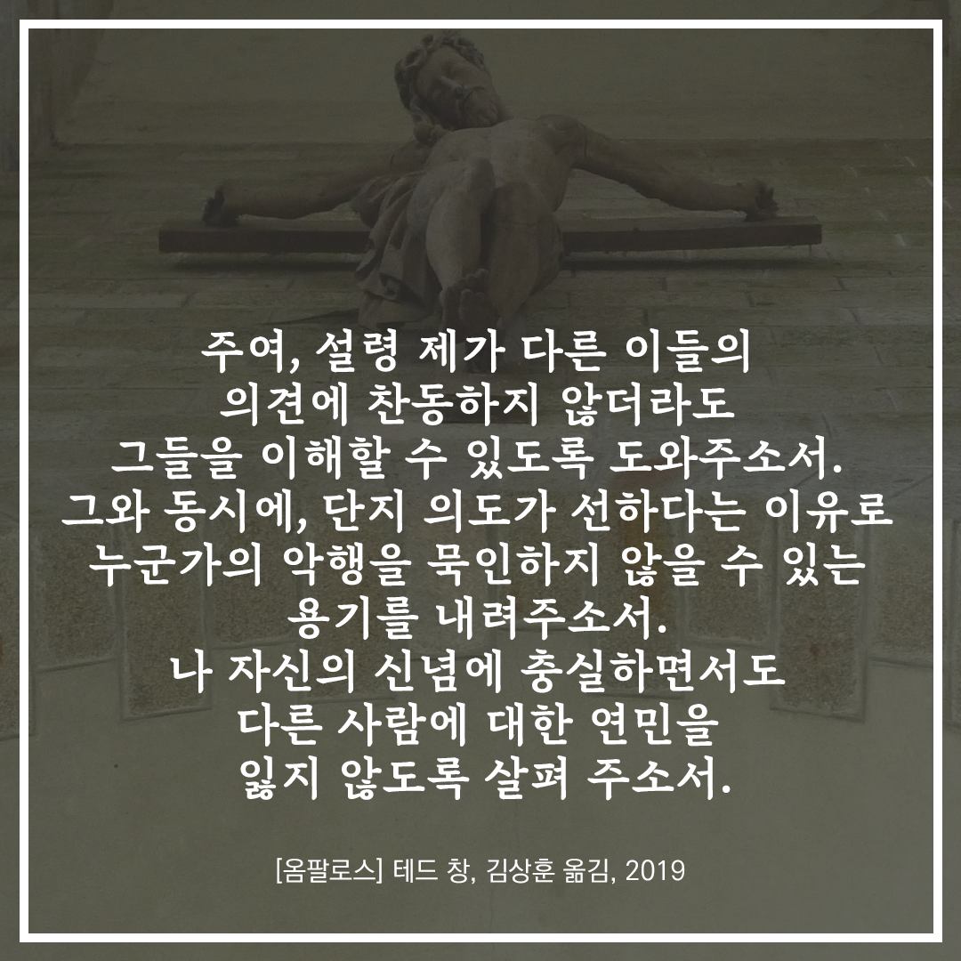 어디선가 과학자들은 결국 종교에 귀의하게 된다는 말을 읽은 것도 같습니다. 그런 거죠... 상상을 해보면, 해답을 찾아보겠다고 파고 또 팠더니 결국 알 수 없다는 절망감... 그런 상황에서 신의 존재는 얼마나 크게 다가올까... 테드 창의 작품들 속에서도 신의 존재는 피할 수가 없어 보입니다.