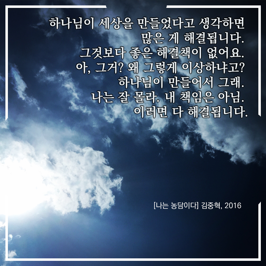 [나는 농담이다]는 신에 대한 이야기도, 아니고 그렇다고 농담에 대한 이야기도 아닙니다만 묘하게 같이 읽는 다른 책들에 의해서 이렇게 완성이 되었습니다.