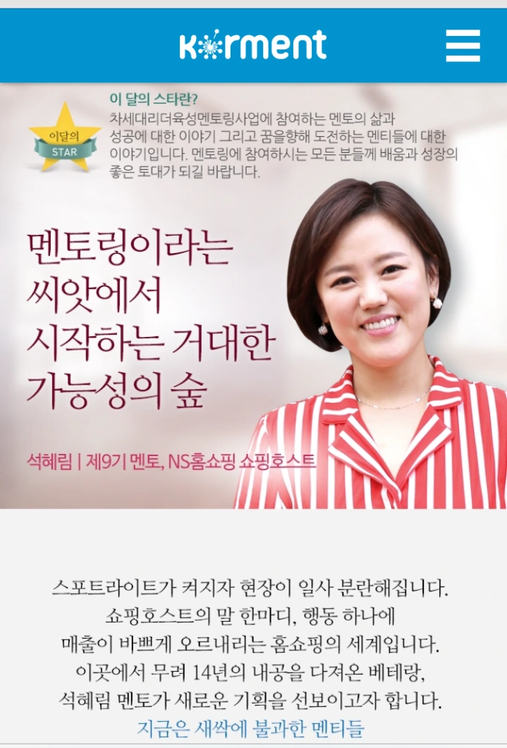 올해부터 좋은 기회로 ‘한국 장학재단’의 차세대 리더십 이라는 멘토링을 하게 됐는데, 이 프로그램을 통해 홈쇼핑 유통이나 쇼핑호스트에 관심이 많은 대학생들을 만나서 교육적 지원을 해주고 있다.