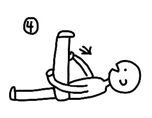(3) 한 다리를 내리고 굽힌 반대 다리를 왼쪽으로, 상체는 오른쪽으로 비튼다.
