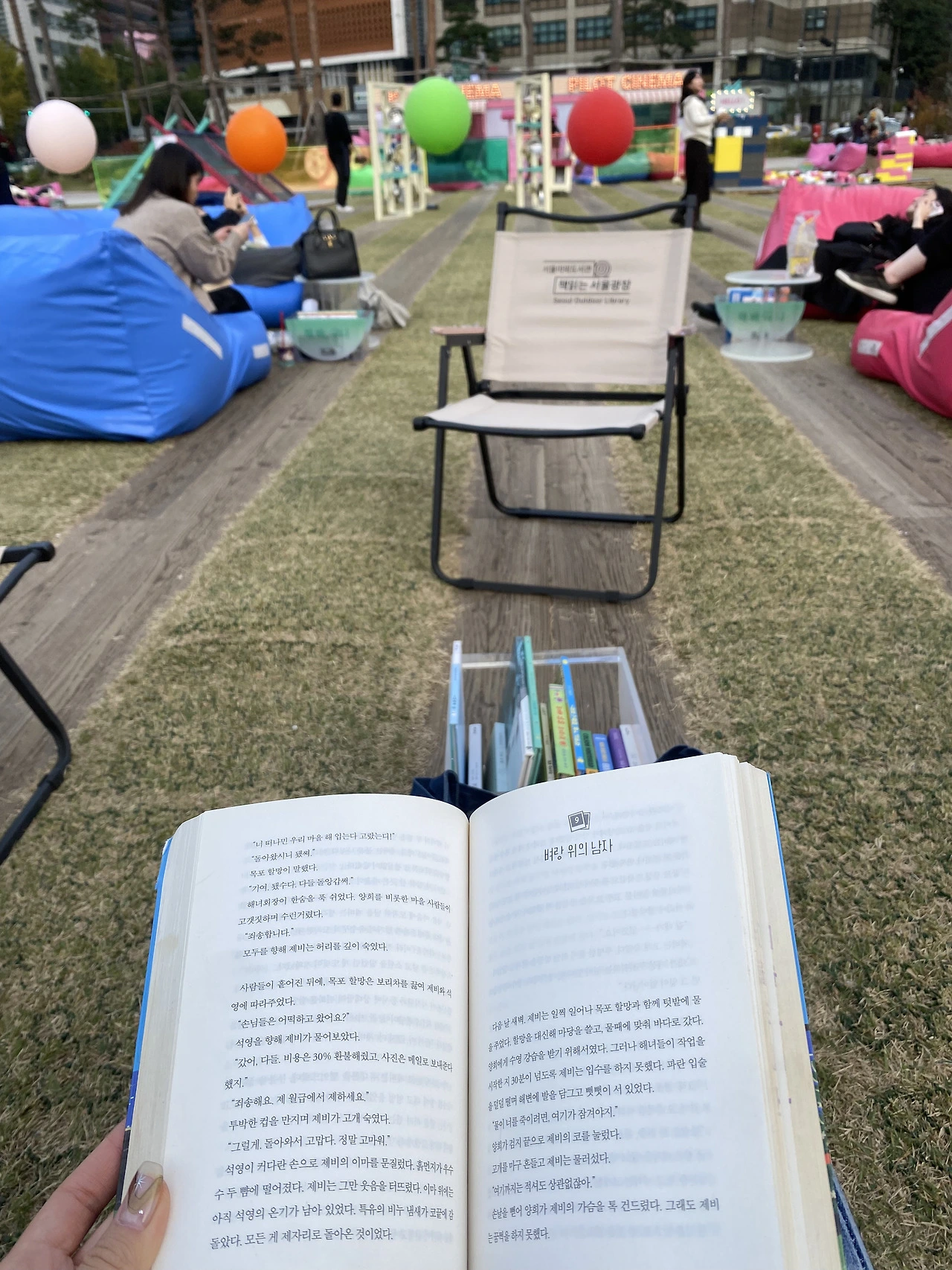 - 오늘은 서울시청 도서관 앞 잔디마당에서 야외독서를 할 수 있는 금요일. 모르고 와서 그런지 더 기분 좋게 야외독서를 할 수 있었다. 해가 점점 사라지더니 쌀쌀해지는 날씨에 이제 안에 들어가서 읽을까 고민하다가 울컥하는 포인트들을 읽으며 자유롭게 눈물이 흐르도록 놔두더라도 찬 바람 때문에 흐르는 눈물인척 할 수 있어서 최대한 버티다가 들어왔다.