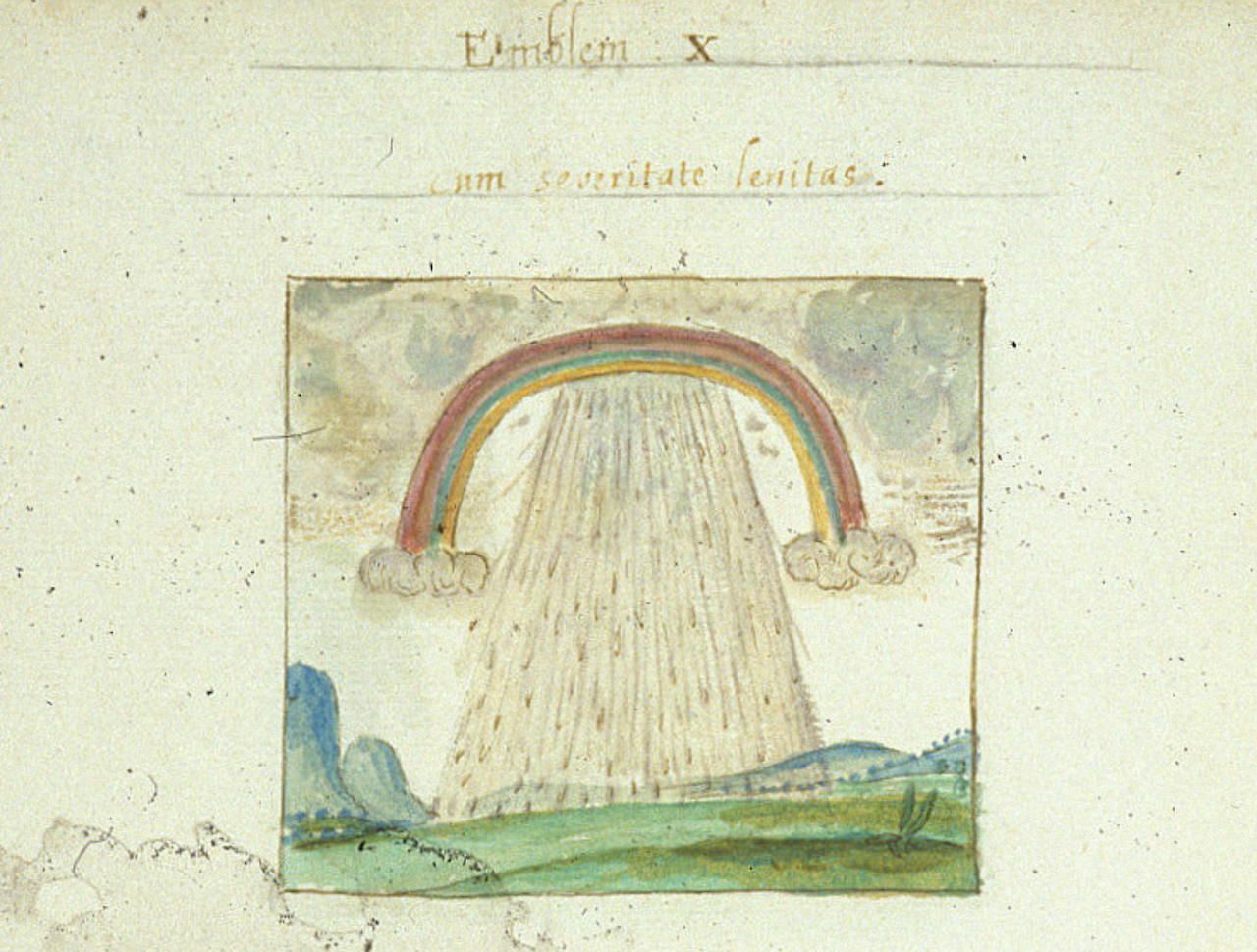 "Tinted drawing of Book 2, Emblem X: Cum severitate lenitas (Severity with Mercy) represented by a storm cloud and a rainbow. Image taken from f. 17v of Three books of emblems, prefaced by a letter from Henry Peacham addressed to Henry Frederick, prince of Wales, and based on the Basilikon Doron (Royal Gift), James I's book of advice to his son and heir. Written in Latin, Greek, English."