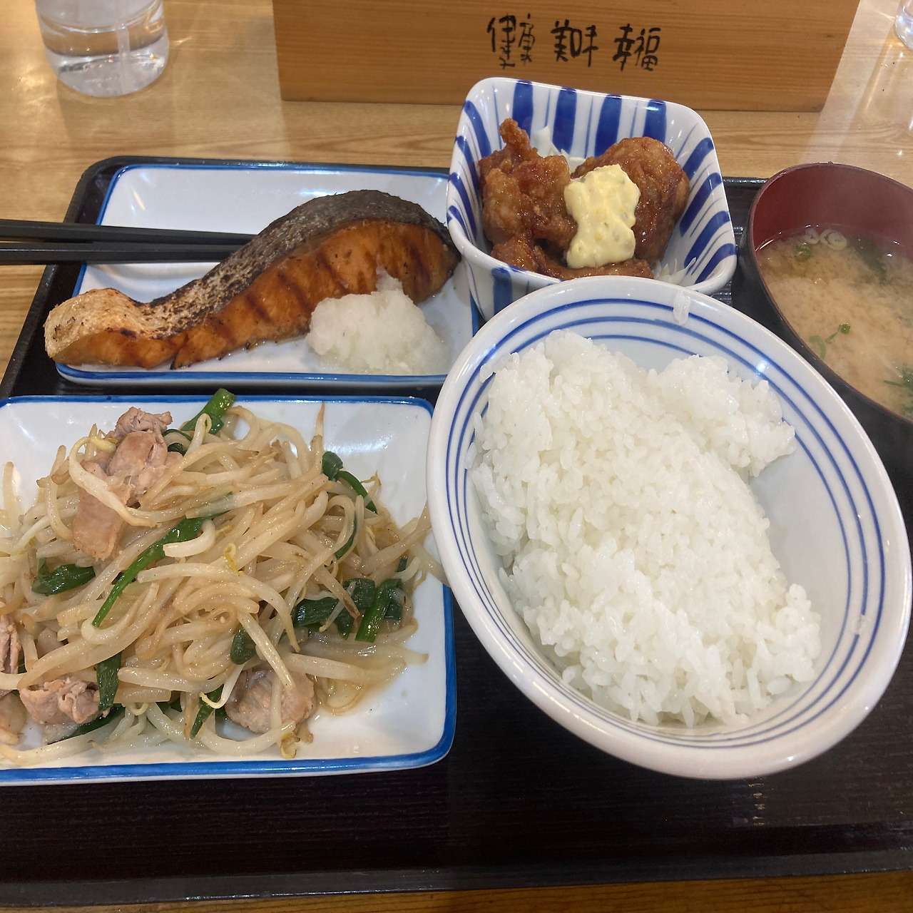 밥, 미소된장국, 연어구이, 가라아게, 돼지고기 숙주볶음(총 대략 1,300 엔)