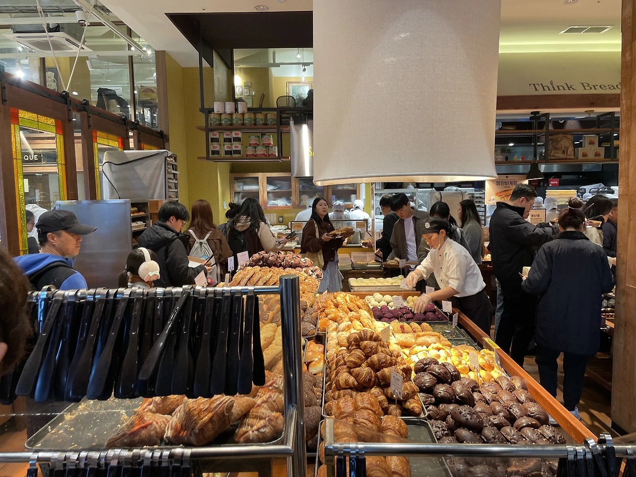 매대에 진열된 수많은 빵과 케이크를 보면 없던 물욕이 생길 정도이지만, 마음을 가다듬고 몇 가지만 신중하게 골랐다. 내가 고른 건 처음부터 찜해 뒀던 순수롤, 치아바타(맛 비교를 위해), 슈크림빵, 팥빵(남편의 최애), 감자빵, 쑥빵, 명란 바게트(이것도 인기가 있다고 해서), 야키소바 샌드위치(아침도 제대로 못 먹은 남편 식사용, 사실 다른 샌드위치 종류도 많았지만 야키소바 샌드위치는 나올 때를 맞추기가 힘들다고 앞사람이 이야기하는 통해 그걸로 골랐다)' 정도였다.