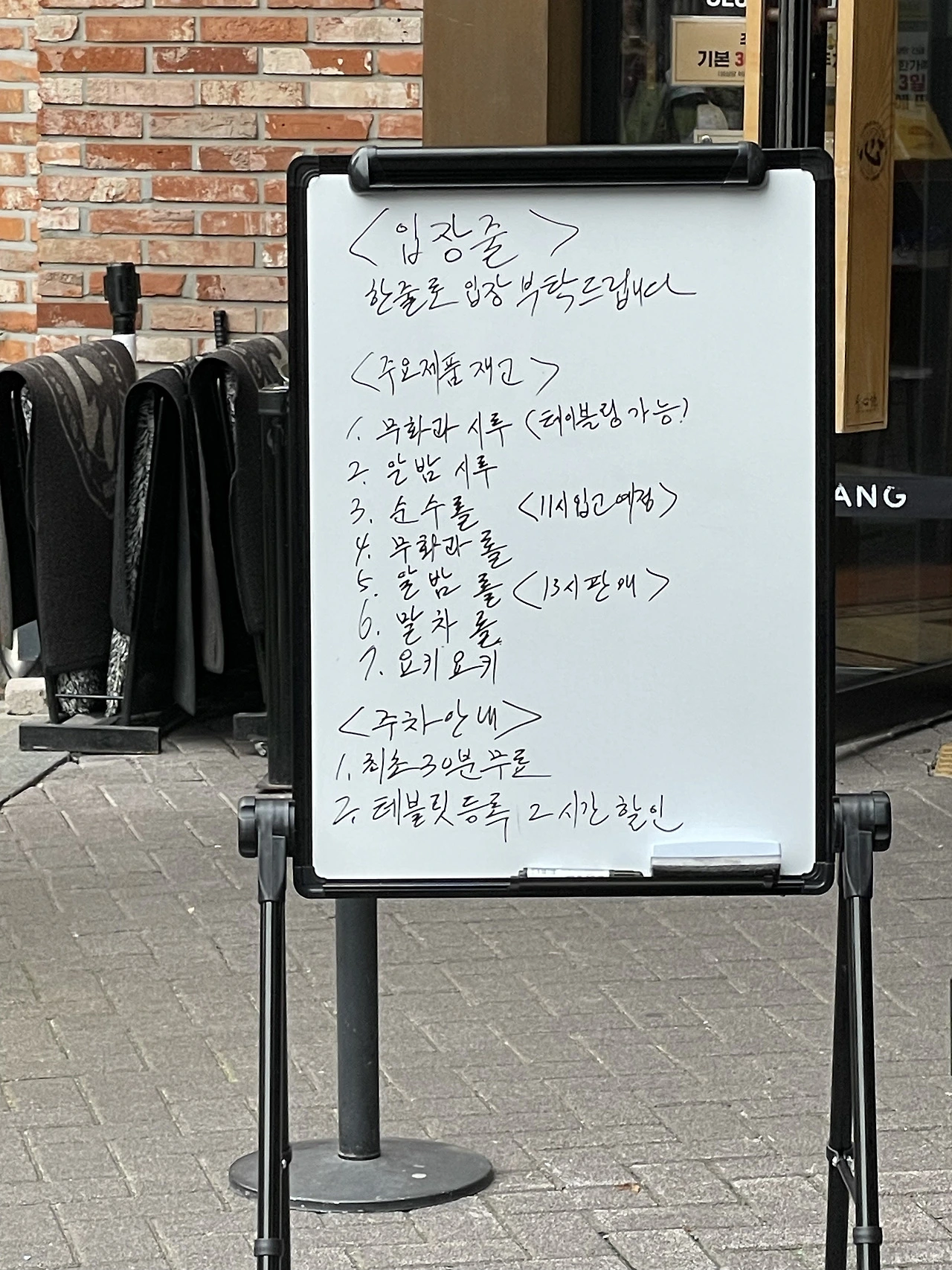 기다리는 동안 어떤 빵을 살지 머릿속으로 고르고 있는데 입구 앞에 붙은 푯말에 현재 빵 재고와 인기 있는 빵 입고 시간이 적혀 있는 것이 보였다. 내심 찍어 두었던 '순수롤'은 11시에 나온다고 했다. 그걸 보자 앞의 커플이 한숨을 내쉬었다. 그러고선 어떻게 하냐며 걱정 어린 목소리로 소곤거렸다. 옆에선 다른 아저씨가 핸드폰으로 "순수롤, 11시에 나온대"라고 이야기하고 있었다. 그런데 그 순간, 입장 줄을 통제하는 아저씨가 '순수롤' 옆에 적혀 있던 '11시 입고'라는 글자를 지우며, "순수롤, 나왔습니다" 했다. 앞 커플이 작게 환호성을 질렀다. 순수롤은 꼭 사야겠다는 생각이 더욱 강하게 들었다.