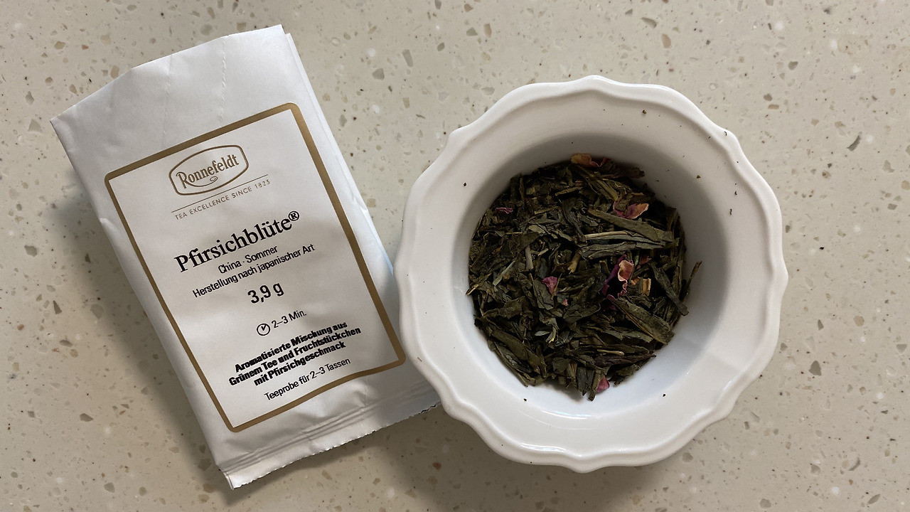 독일어로 복숭아꽃이라는 뜻을 가진 이 차는 복숭아, 망고 조각, 장미, 향료로 구성되었어요. 빳빳한 건잎과 듬성듬성 보였던 붉은 꽃잎이 야들하게 풀어져 황금빛 수색으로 퍼져요. 푸릇한 녹차향과 달콤한 복숭아 향이 뒤섞여 잔잔하게 풍겨요.