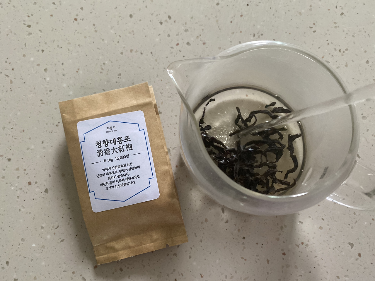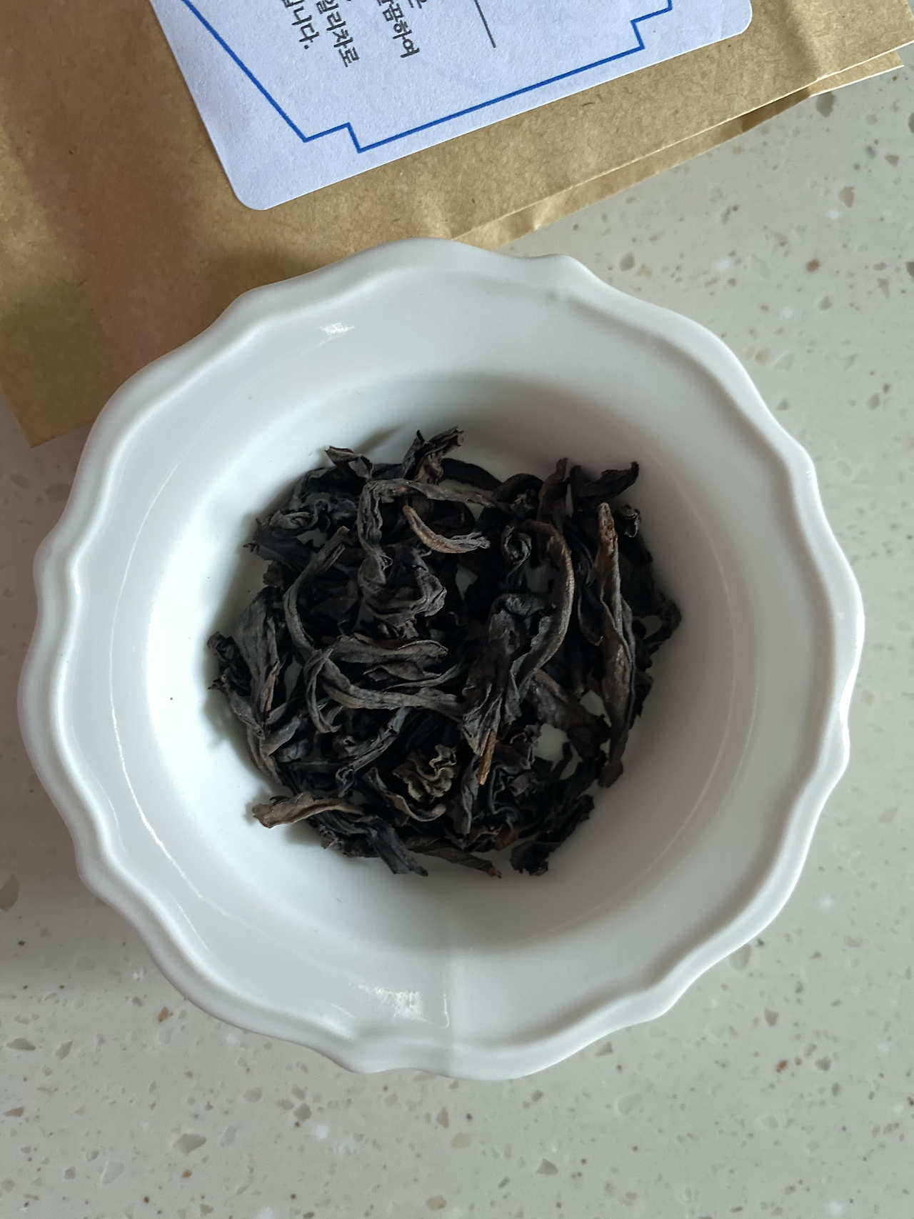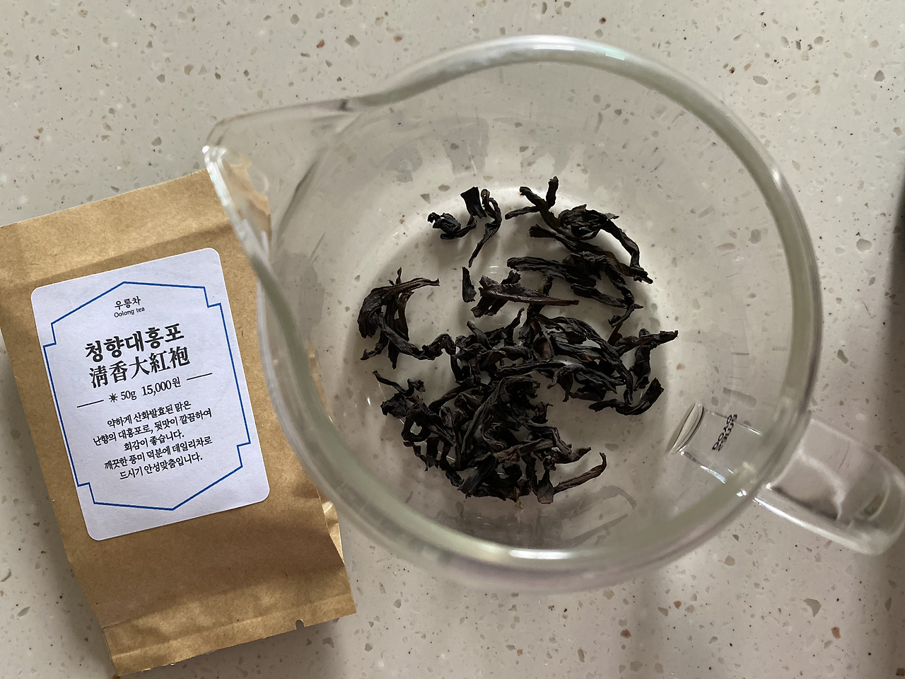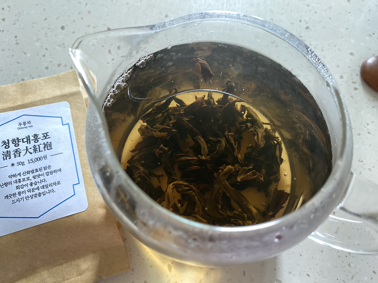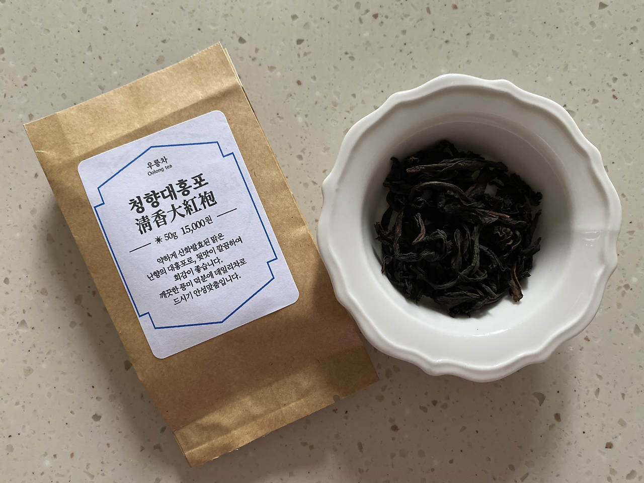 청향 대홍포는 대홍포종에 청향(맑은 향기)이 풍기는 우롱차라는 뜻인가 봐요. 전체적으로 진한 어두운 색깔의 잎인데 드문드문 붉은기가 감도는 부분도 있어요. 크기도 제법 크고 길쭉한 잎이 반쯤 잘려서 돌돌 말려있는 형태네요.