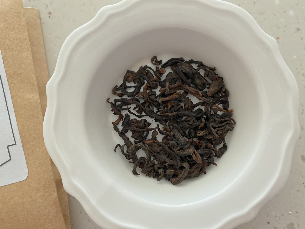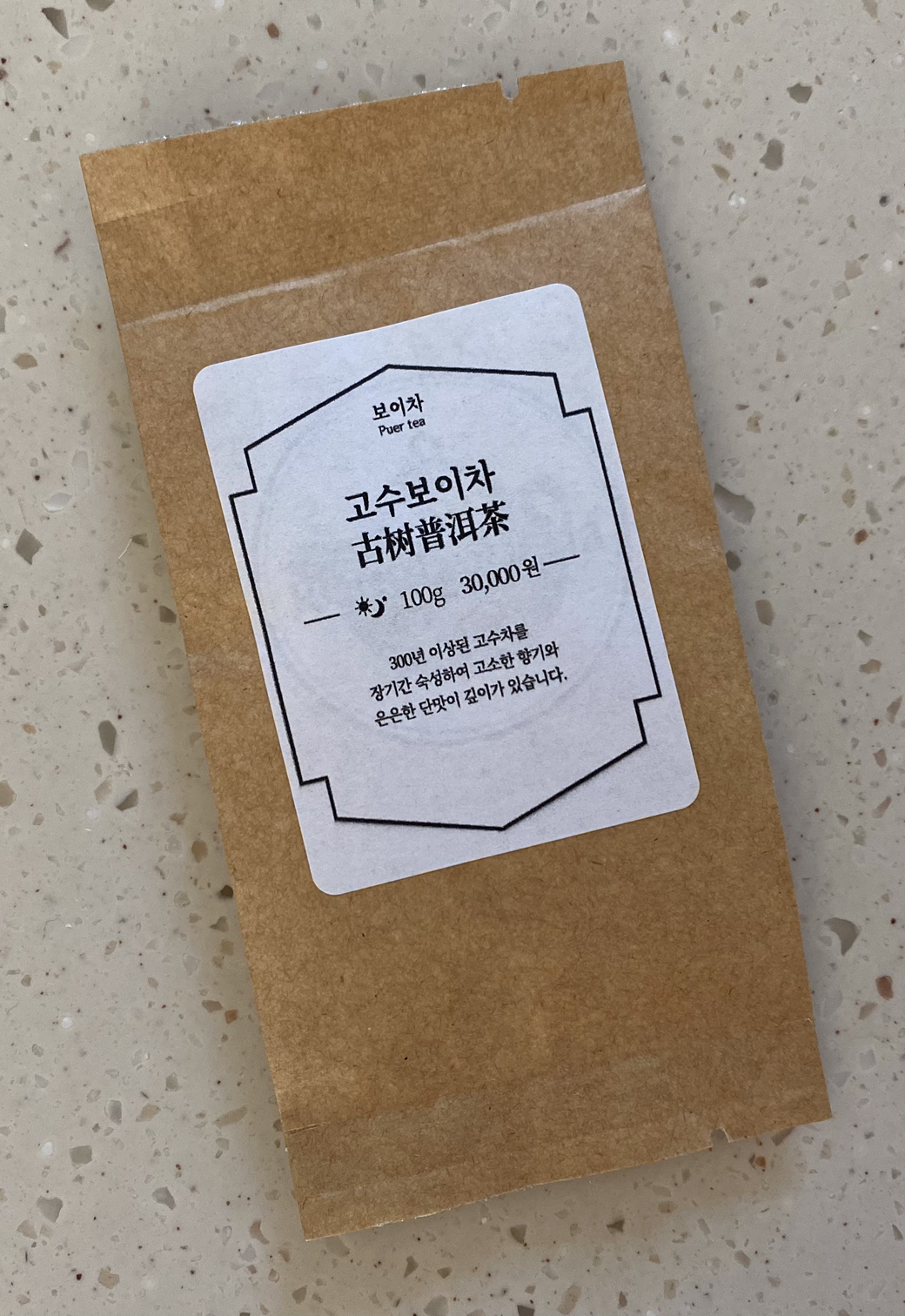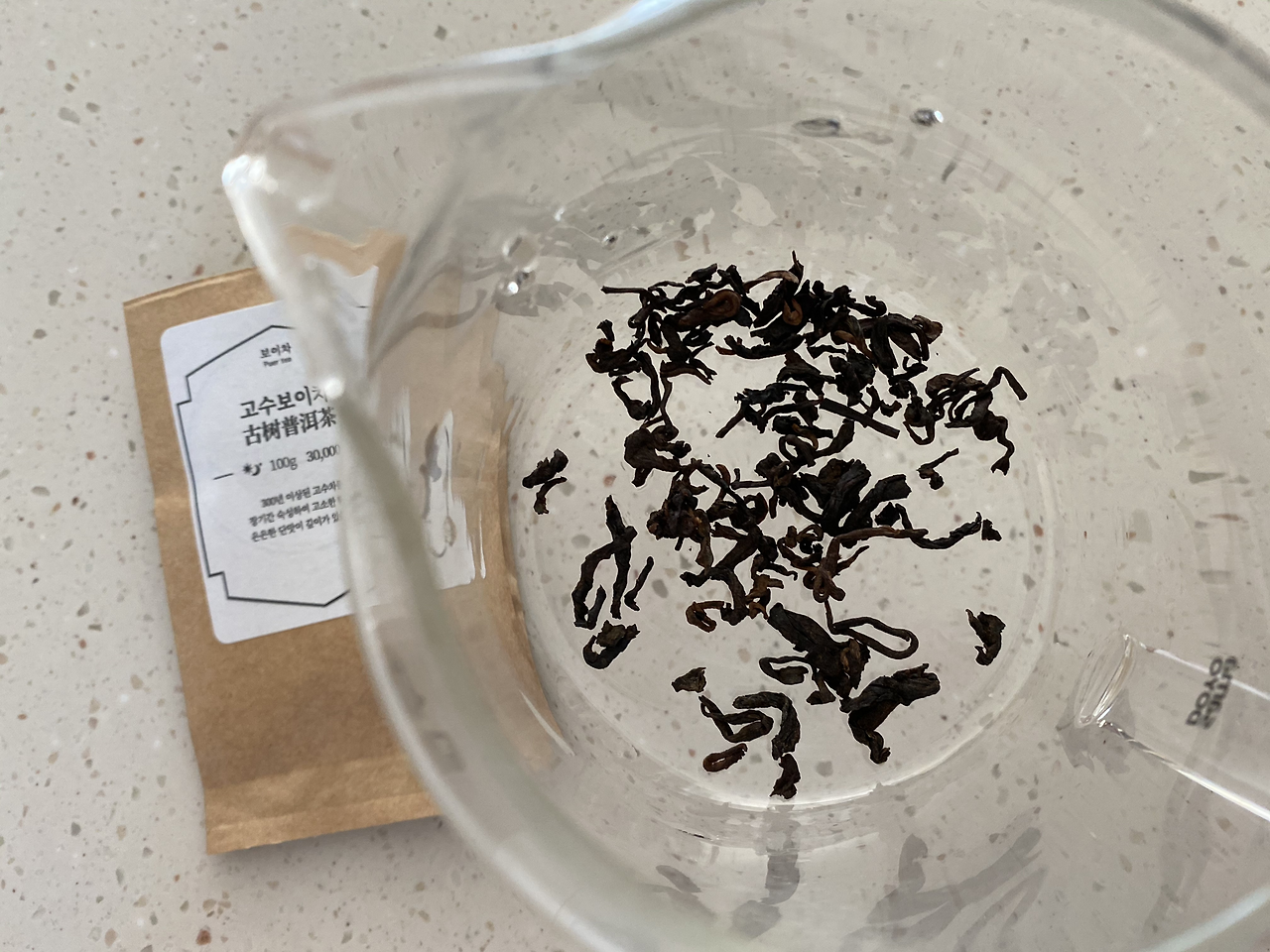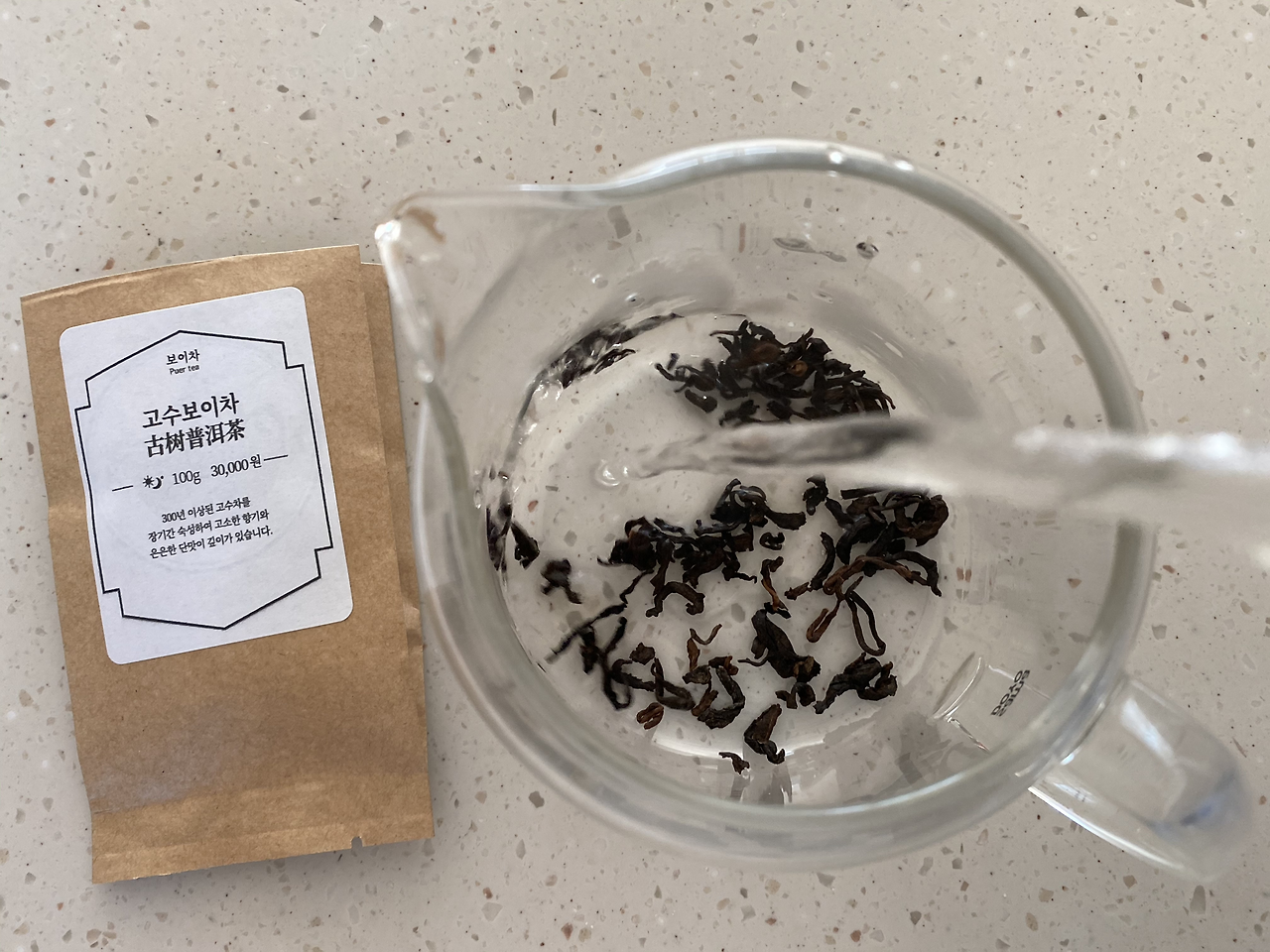 고수 보이차는 300년 이상된 고수차로 장기간 숙성했다고 하네요. 오래 압착되었던 찻잎이라 그런지 같은 2g인데도 소량으로 보여요.