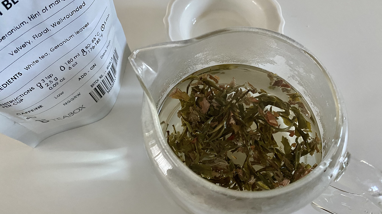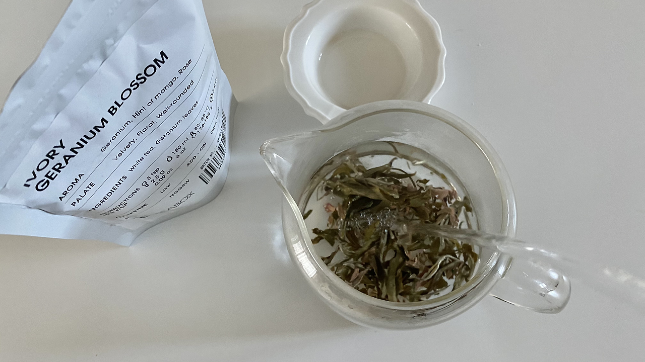 100도씨로 끓인 물을 한 김 식혀서 물 200ml, 잎차 2.5g을 넣고 5분 기다려요. 잎에 물에 닿자마자 향긋한 향기가 풍기는가 싶더니 어디서 맡아본 냄새가 나요. 목욕탕에 있는 건식 찜질방에 들어가면 나는 마르고 후덥한 냄새 같아요. 제라늄 꽃이랑 망고향, 장미향이 섞여있다고 쓰여있는데 언뜻언뜻 달콤한 향기와 장미향이 나기도 해요.