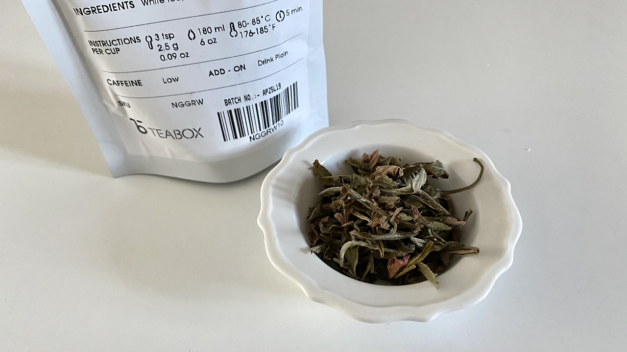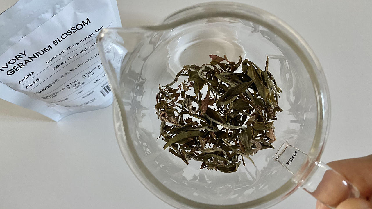 주말에 본 낙엽들은 밟으면 바스락 소리를 내며 으스러질 정도로 건조했는데요. 아이보리 제라늄 블라썸 백차 잎도 가을 낙엽처럼 바스락 거렸어요. 이때껏 봤던 잎차들 중 제일 건조한 잎이었어요. 다른 잎차를 마실 때와 똑같은 양의 잎차를 담았는데 가벼워서인지 수북이 쌓였고요.