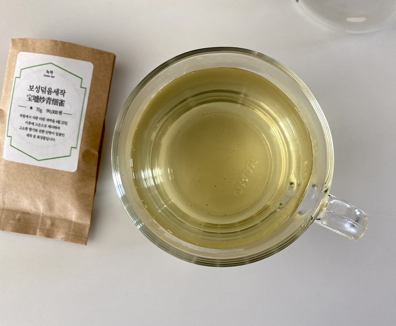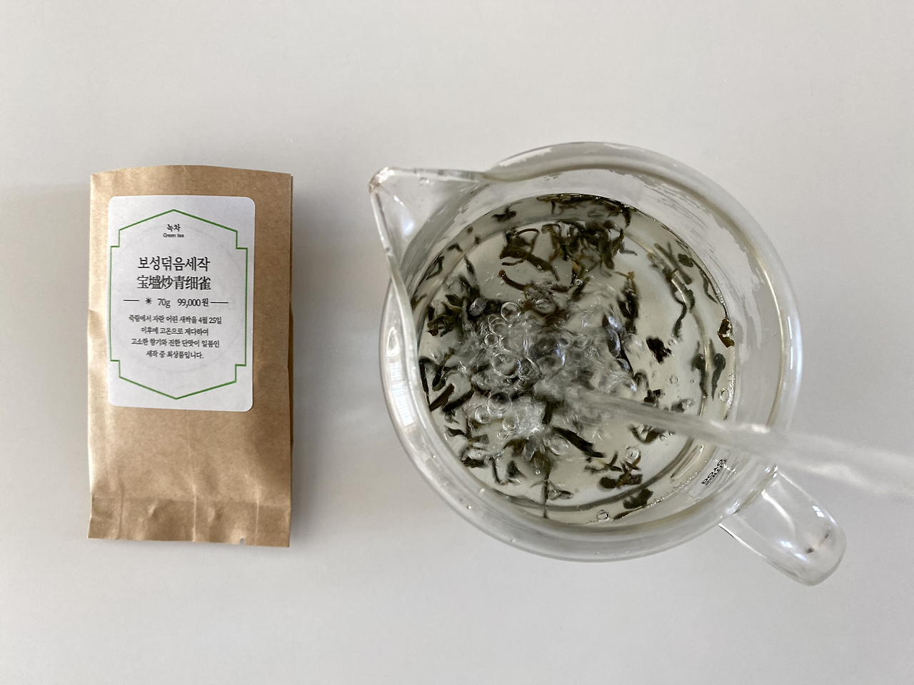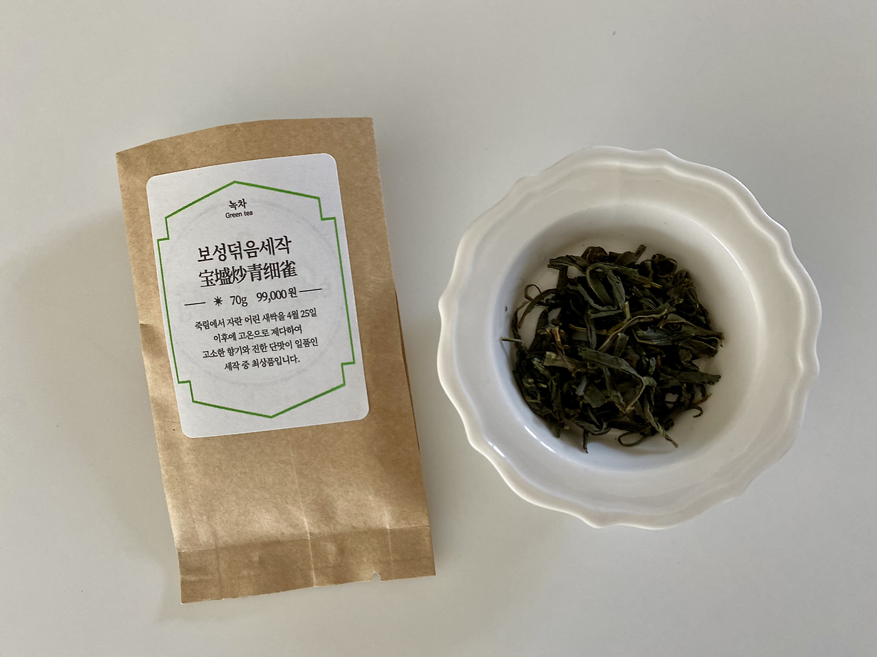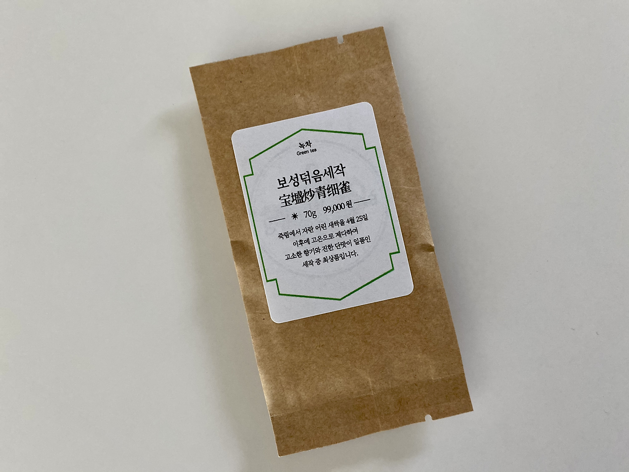 보성 덖음 세작은 죽림(대나무 숲)에서 자란 어린 새싹을 고온의 무쇠솥에 빠르게 덖어낸 차인데요. 세작은 우리나라 차 특유의 제조시기를 분류한 호칭으로 절기상 곡우에서 입하 사이의 기간을 뜻해요. 양력으로 4월 20일 ~ 5월 6일 사이를 말하는데 봉투에는 4월 25일 이후라고 써져있어요.