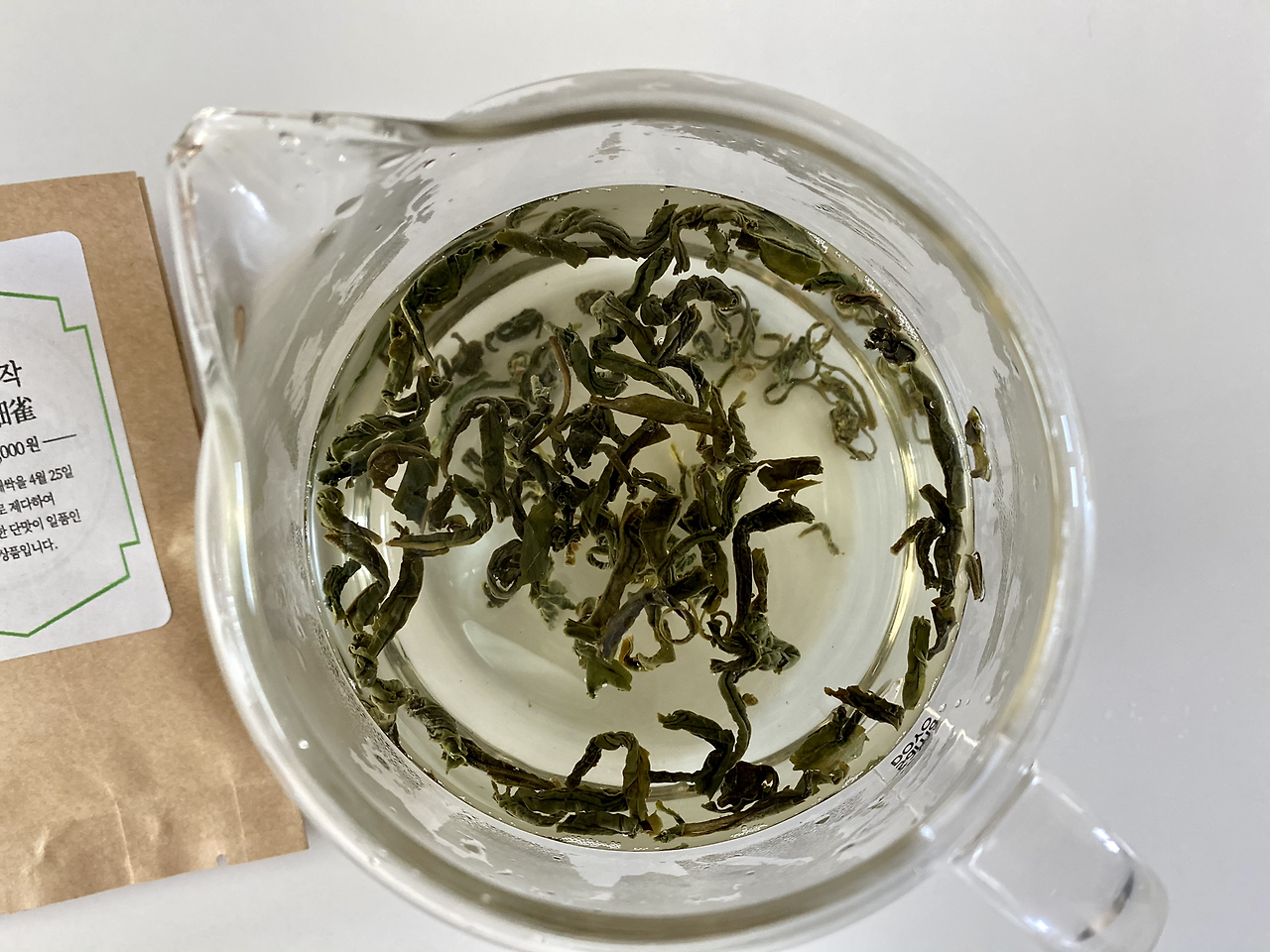 우려낸 후의 찻잎에서도 고소한 향기가 진하게 남아 있어 코를 박고 향을 맡다가 보니 상처 하나 없이 통통하게 윤기를 내고 있네요. 과연 좋은 잎차구나 싶더라고요. 가격이 꽤나 높은만큼 맛도, 향도 귀한 한 잔이었어요.