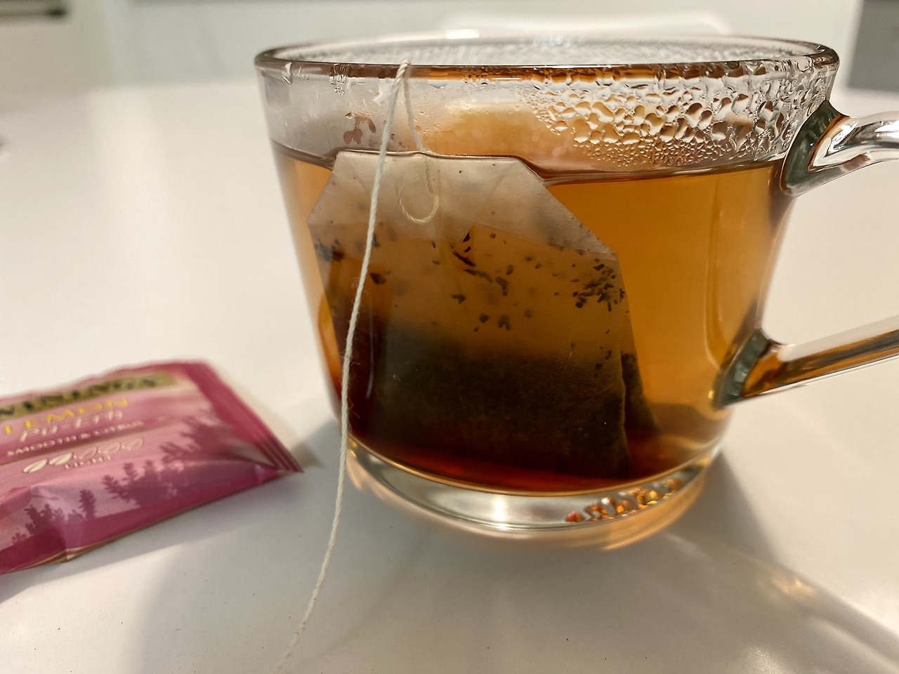 기다림 끝에 티백을 건져내요. 진하게 우러나와 바닥에 깔려있던 찻물이 섞이며 자연스럽게 농도가 맞춰져요. 한 모금 마신 레몬 푸얼 티는 상큼한 향기와 부드러운 맛이 잘 어우러져 부담 없이 마시기 좋네요. 보이차의 묵직한 맛은 그대로 살리고 다소 어려울 수 있는 향기는 상큼한 레몬 향으로 덮어주니 깔끔하게 마시기 좋은 차예요.