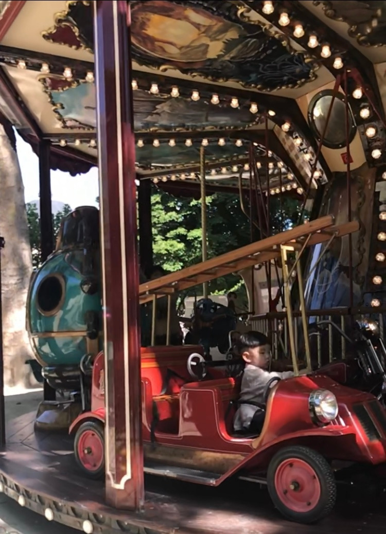 아이는 말, 마차, 자동차, 비행기 등 좋아하는 탈것들이 달려있는 회전목마에서 눈을 떼지 못했고 우리는 회당 1유로를 내고 타는 이용권을 구매할 수밖에 없었다. 아이가 '음마' 하며 가리키는 자동차에 앉혀주고 기구 밖으로 나와 펜스에 팔을 옆으로 펼쳐 기댔다. 타는 아이가 혼자여도 누구를 기다리는 시늉도 없이 회전목마는 거침없이 돌아갔다.
