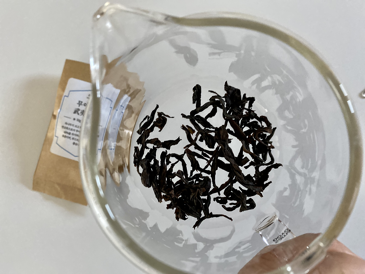 무이암차 품종 중에 총생산량의 60%를 차지한다는 무이수선을 꺼내봤어요. 푸젠성의 북쪽에 위치한 무이산에서 자란 나무인데, 크기가 크고 뿌리가 깊게 내리는 반교목에서 채엽한 찻잎이에요.