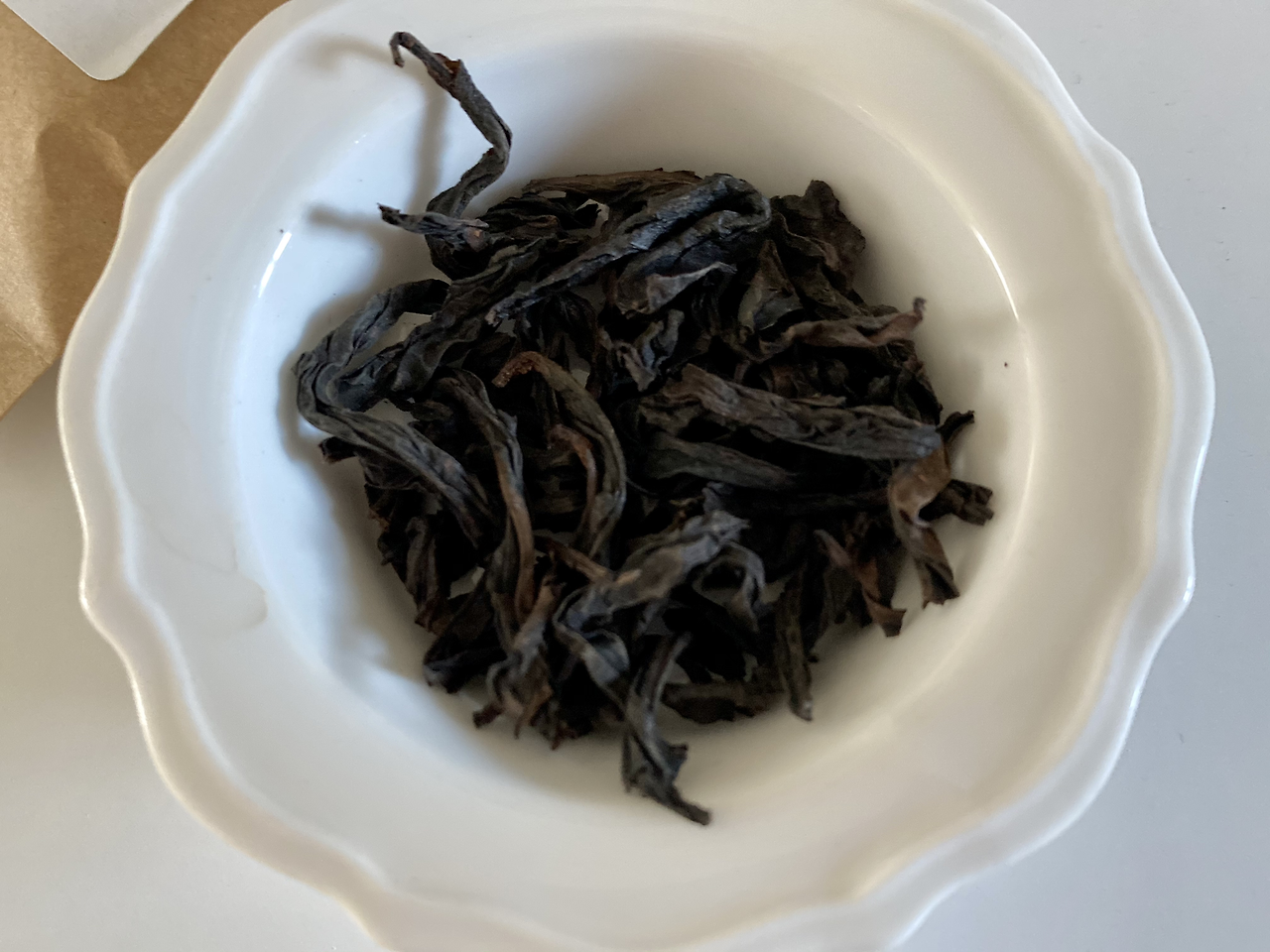 찻잎이 길쭉하게 말린 모양을 보니 확실히 넓고 큰 찻잎이었다는 것을 추측할 수 있어요. 꼭 미역처럼 말려있는데 향기도 비릿하게 말린 미역 향이 나요.