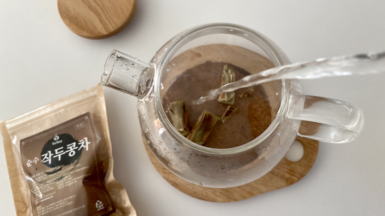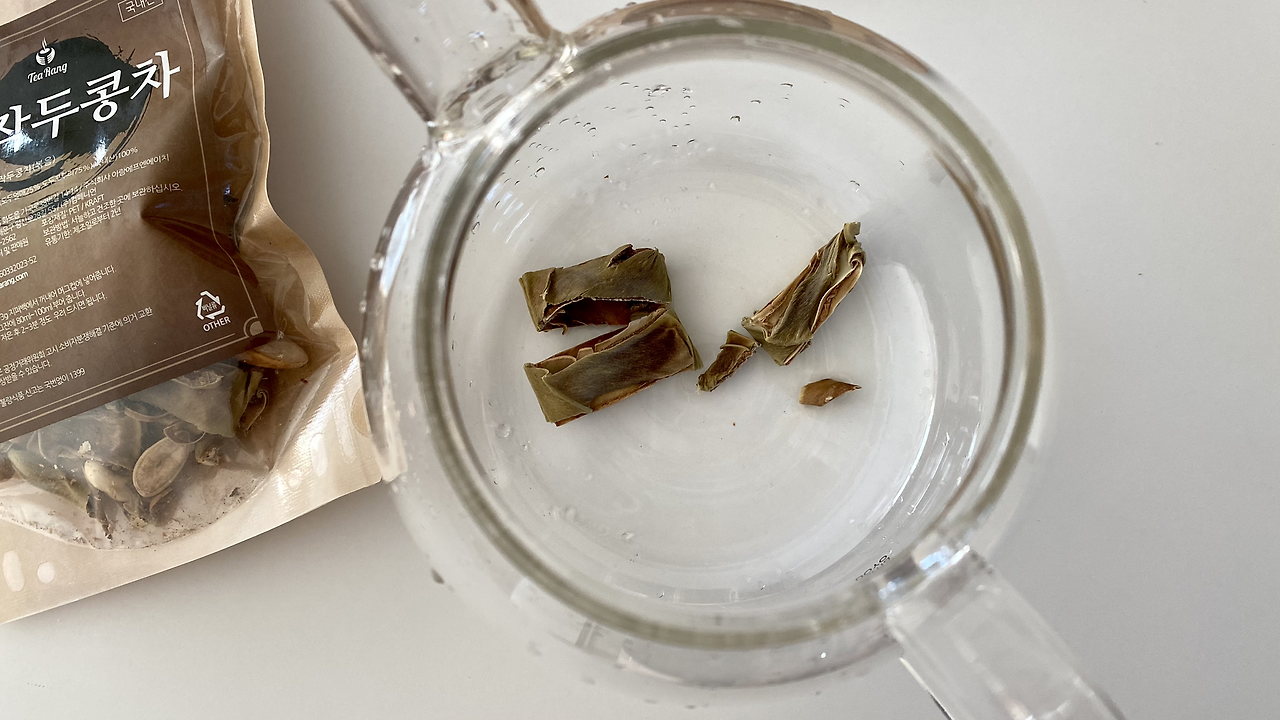 작두콩차 3g, 물 100ml를 온수나 냉수 상관없이 부어 2~3분 우려 마시면 되는데요. 집에서 오며 가며 마시려고 용량이 큰 유리병에 작두콩차 3조각을 넣고 끓는 물을 넣어 우렸어요. 물이 뜨거워서인지 금방 갈색빛 수색이 돌기 시작했는데 진하게 마시고 싶어서 시간 대중 없이 넣어뒀다가 수색을 보고 작두콩차를 빼냈어요.