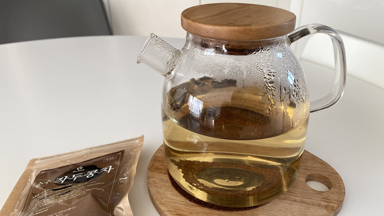 보리차와는 다르게 구수한 향이 나는데요 살짝 콩비린내가 나는 것도 같은 작두콩차예요. 혀끝에 닿은 작두콩차에서 단맛이 느껴지다가 끝에 아주 미세하게 수렴감이 느껴져요. 그래도 구수한 맛이 커서 전혀 거부감 없이 마실 수 있어요. 미지근하게 식혀서 아이에게 주니 고소하다고 잘 받아 마셔요. 작두콩을 우려 마시면 염증을 완화시켜주는 항산화물질을 섭취하기 좋다고 해요. 아이의 기관지와 마른기침 증세에 조금이라도 도움이 되었으면 하는 마음은 생기네요. 의학적으로 어떨는지 모르겠으나 작두콩차로 마음의 위로는 받는 시간이었어요.