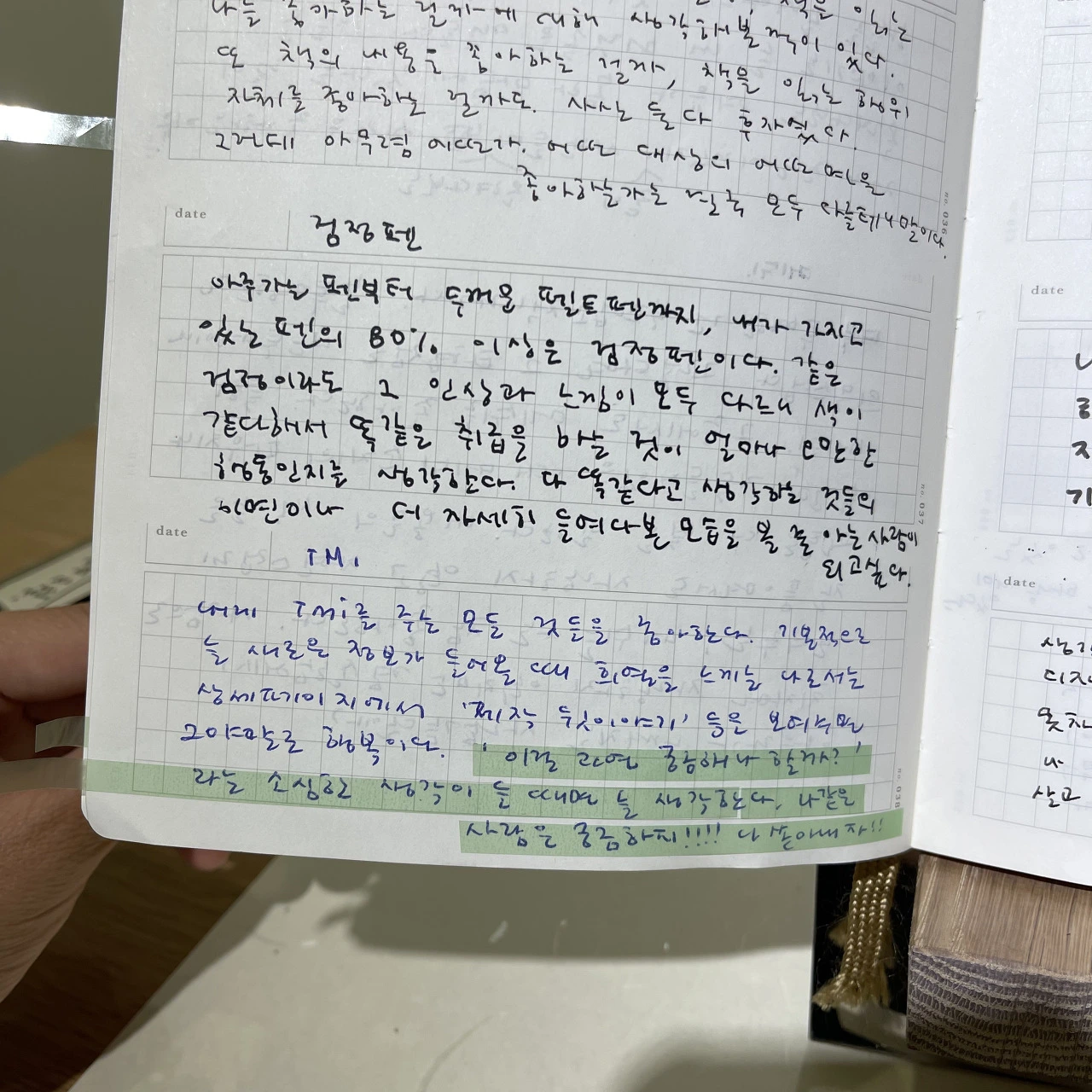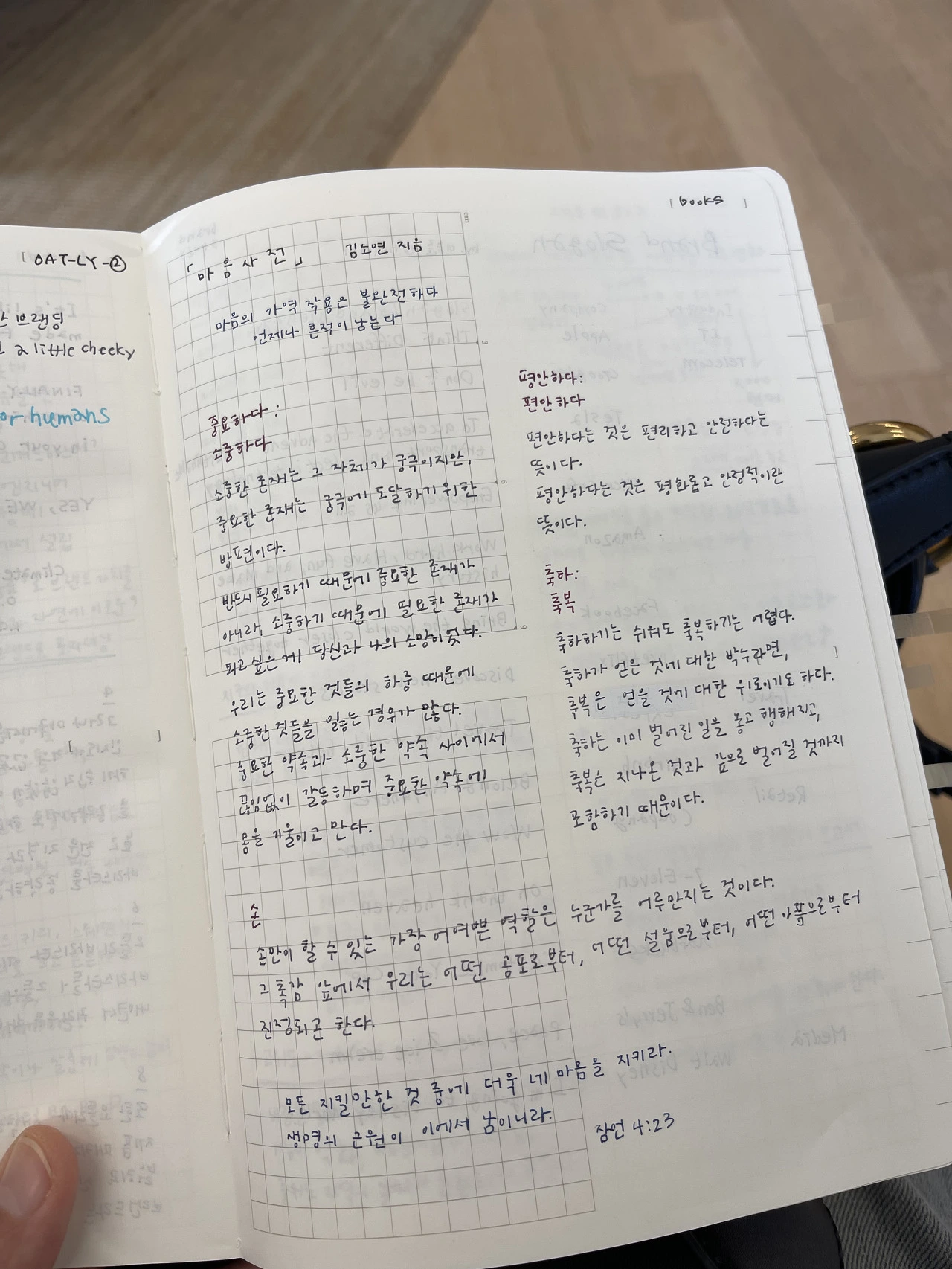 기록하는 사람은 여유롭습니다. 잊을지도 모른다는 두려움이 없어지거든요. 기록하며 내 시간을 관리하게 됩니다. 나아가 조금 더 여유롭게 나를 관리할 수 있게 됩니다. 또한, 노트를 펴고 펜으로 한 글자, 한 글자 적는 것 또한 누군가에게는 부담일 수 있습니다. 키보드로 글자 쓰기보다는 고도의 작업임에 틀림없습니다.