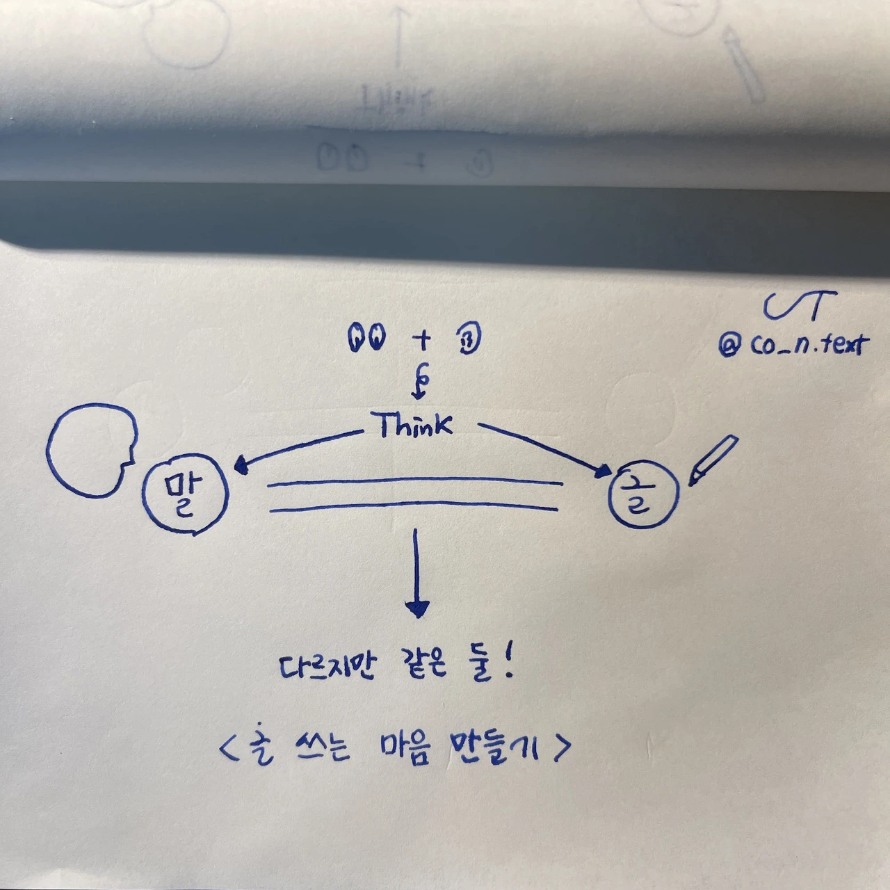 말하기와 글쓰기 두 가지는 모두 내 생각(Think)을 타인에게 전달하는 행위입니다. 베스트셀러 작가와 유명 강연가의 공통점을 확인해 보면 이를 이해할 수 있습니다. 이들은 듣는/읽는 사람(독자와 청중)에게 뾰족한 메시지를 전달하기 위해 그와 걸맞은 다양한 사례를 모으게 되죠. 그들과의 소통을 통해 우리는 카타르시스를 느낍니다. 우리는 여기서 깨닫게 됩니다. 훌륭한 메신저는 사회에 관심이 많고 경청하는 사람이라는 사실을요.
