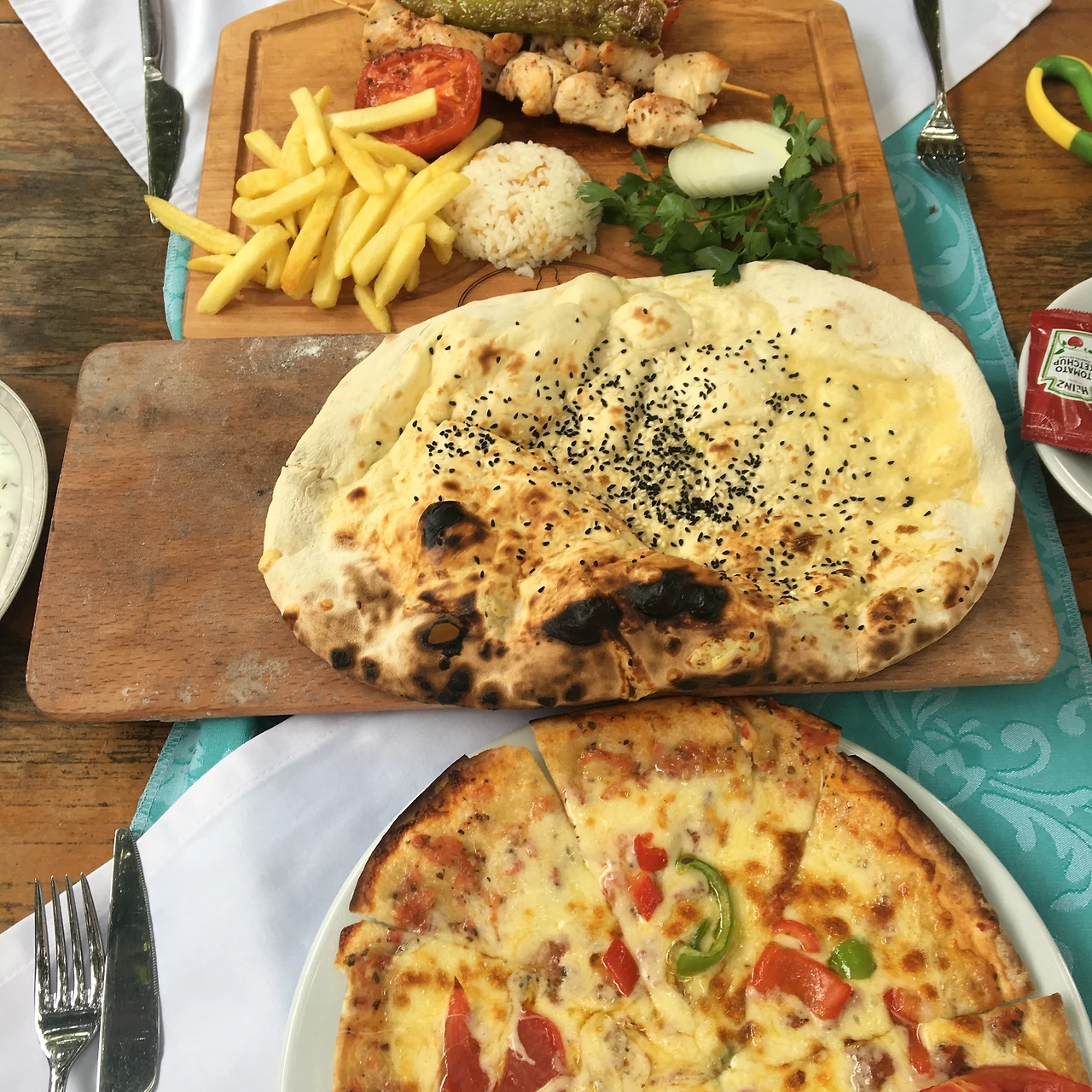 식전 빵은 담백한 평범한 밀가루 빵이었는데 짜고 단맛이 없이 담백한 맛이 일품이었고, 함께 나오는 올리브 열매 절임은 소금에 절인 것부터 살짝 고춧가루를 버무려 매콤한 맛이 나는 것, 건포도처럼 바짝 말린 것 등이 있는데(맛은 일반 올리브지보다 조금 더 새콤하다), 우리로 치면 단무지나 김치 정도 되는 위치의 반찬 같았다. 필요한 하루치 나트륨은 이 올리브 절임에서 모두 섭취할 수 있을 것 같은 올리브 절임을 입에 물고, 따듯한 식전 빵을 먹으면 거창한 다른 음식이 생각나지 않는다. 게다가 이 빵은 원하면 언제든지 리필까지 된다. 어째서인지 나는 터키 여행에서 들른 식당의 식전 빵과 올리브 절임은 절대 남기지 않았다. 당신들의 호의를 나는 무시하지 않겠소 하는 마음이었는지도 모른다. 식전 빵을 다 먹고 나온 닭고기 케밥과 터키식 피자인 ‘피데’는 담백하고 솔직했다.