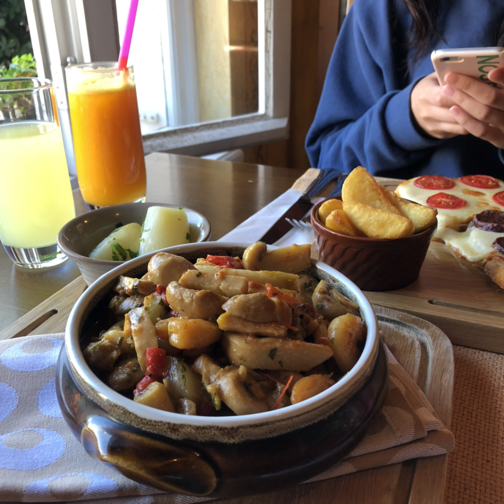 밤새 내린 비덕에 루프탑 쿠션들이 축축했지만 용케도 젖지 않은 쿠션을 찾아 자리를 잡고는 따듯한 차이를 주문했다.