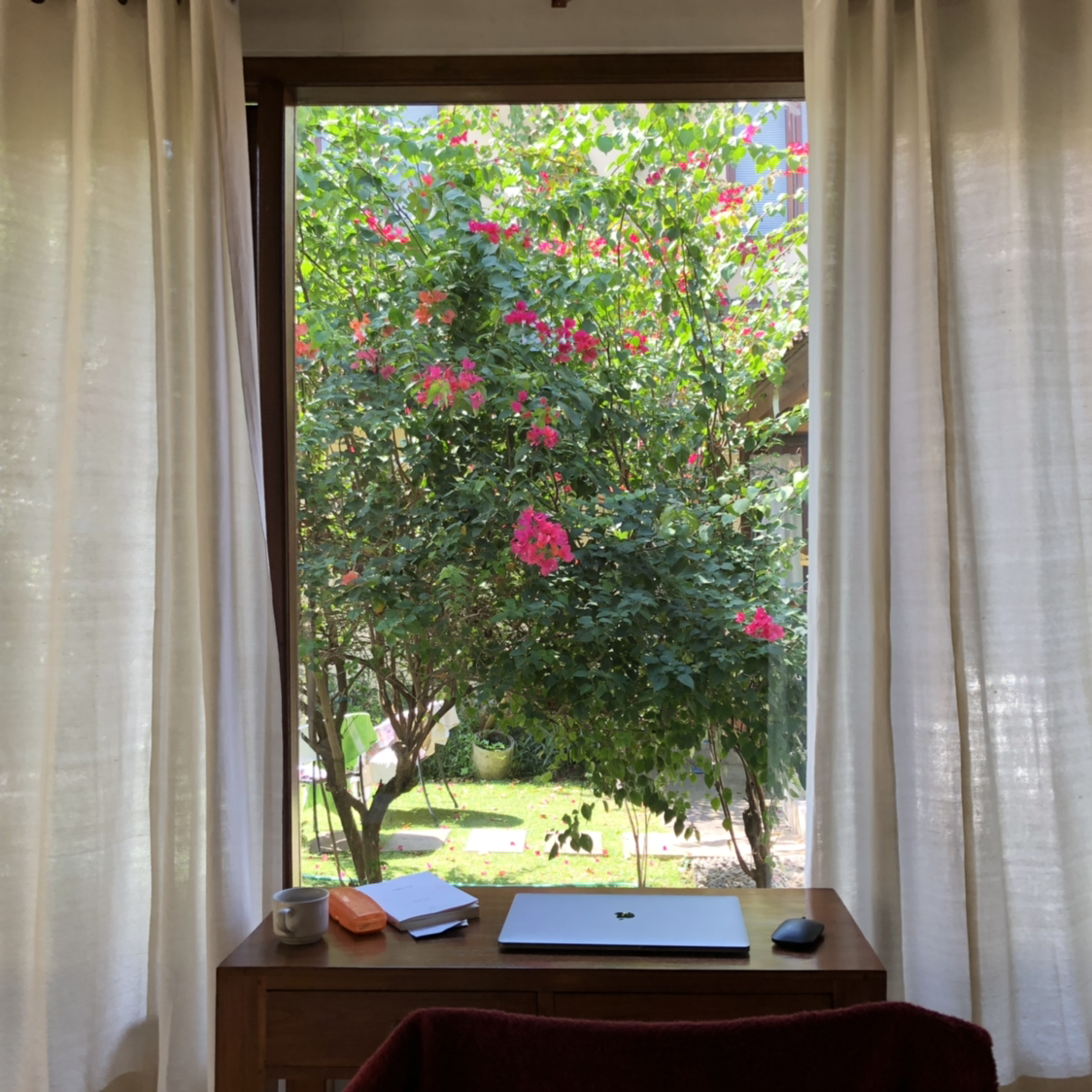 사실 이번 휴가는 나에게 무리수였다. 첫 번째 이야기에도 말했지만 돈이 없다. 아니, 돈이 나올 구멍이 없다. 계약해놓은 실용서를 끝내야지만 고료를 받을 수 있고, 지금 이 원고의 마감도 얼마 남지 않았는데 통 진도가 안 나가고 있다. 요즘 많이들 디지털 노매드를 한다고 하는데 "아 싸가 되고 싶은 인싸"인 나는 디지털 노매드 정도는 해봐야 되지 않겠냐고 자주 생각한다.(실제로 나는 스스로를 은근히 힙스터를 동경하는 평범녀라고 생각한다) 아무튼 직업상 어디든 떠돌며 일을 할 수 있다는 조건을 가졌으므로 노트북을 챙겨 친구들과 조우하기 전까지 열심히 교재 원고 작업을 어떻게든 절반이라도 끝내 볼 심산이었다. 숙소의 테이블이 벽을 보고 있는 구조라 슬쩍 창가로 책상을 옮겼다. 이보다 더 완벽할 수 없는 업무 환경이 만들어졌다. 모니터를 보다가 눈이 피로해지면 바로 고개를 들어 초록색 나무로 안구를 정화할 수 있는 아름다운 책상 환경. 많은 창작자들이 그런 말을 했지. 환경을 핑계 대다가 결국 아무것도 못하게 될 것이라고. 너무 많은 책에서 이런 말을 읽었기 때문에 어떤 작가가 어떤 책에서 언급했는지는 기억이 잘 나질 않는다. 어쨌거나 나는 이 많은 창작자들이 체득한 이 진리를 몸소 실천하고 있는 중이다.