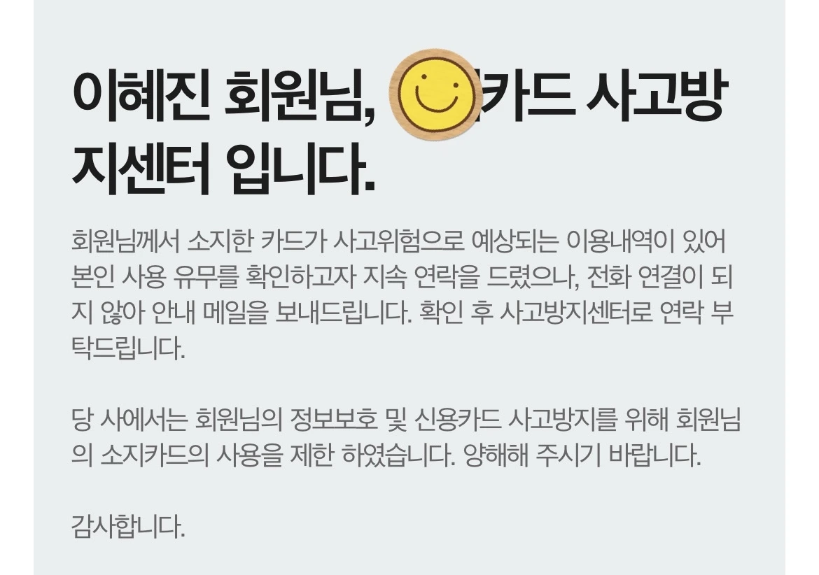 집으로 돌아오는 데 카드 어플에서 해외사기도용 알림본인 사용이 아니라면 도난신고를 해달라는 알림이 지속적이다.