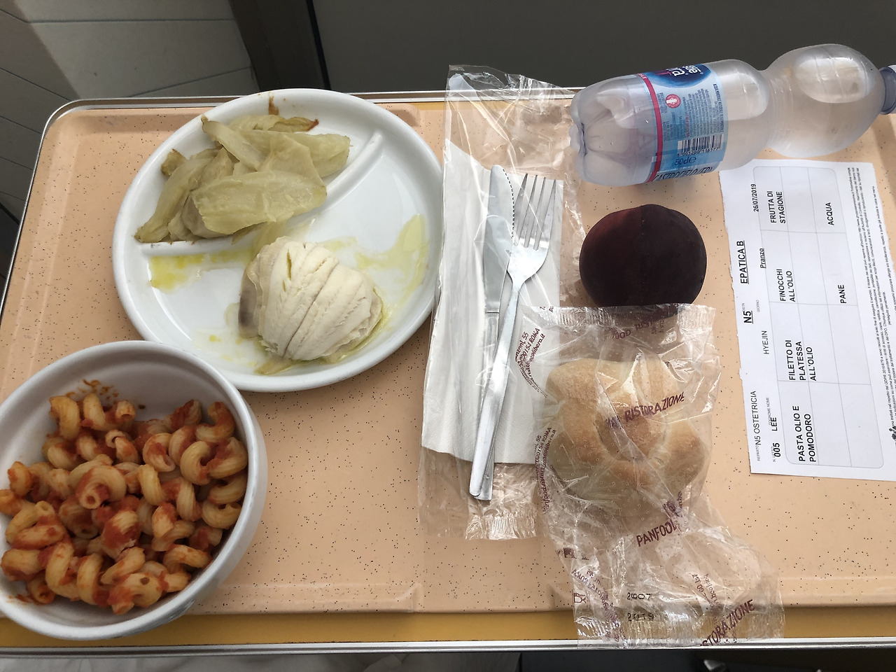 점심엔 토마토소스 파스타와 푹 익혀서 간 조차 전혀 하지 않은 생선찜, 펜넬 볶음, 여전히 딱딱한 빵과 시원한 물, 후식은 딱딱한 복숭아