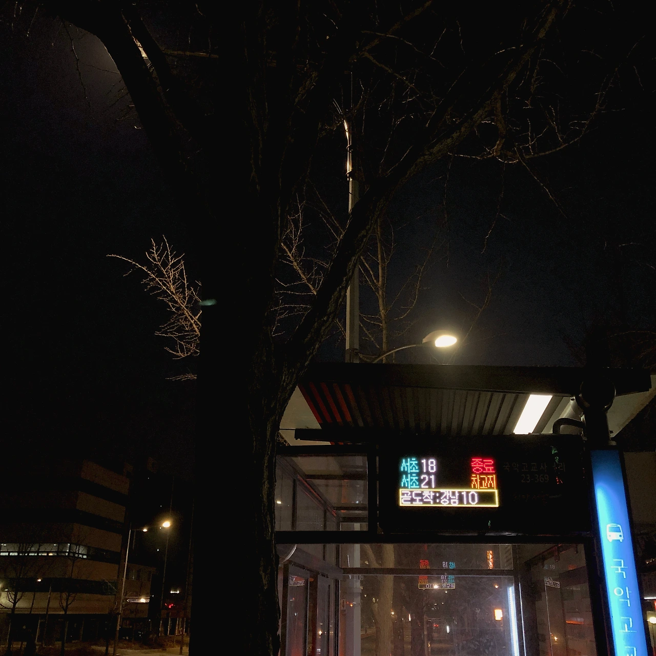 버스 정류장과 주변의 가로등 덕분에 그렇게 무섭지 않은 풍경이었다. 예전에 제주도에 혼자 뚜벅이 여행했을 때를 생각해보면 배차 시간도 20분에다가 정말 안내판 말고는 불빛이 없어서 ‘아, 여기서 납치돼도 모르겠다.’라는 두려움이 든 적이 있다. 전원생활의 여유로움은 모르겠고, 나는 시골의 그 어두움이 무섭다. 특히 젊은 여성으로서는 그런 깜깜함이 위협처럼 느껴지기도 한다. 그래서 이렇게 밝게 비춰주는 불빛이 많은 도시를 - 좋아한다.