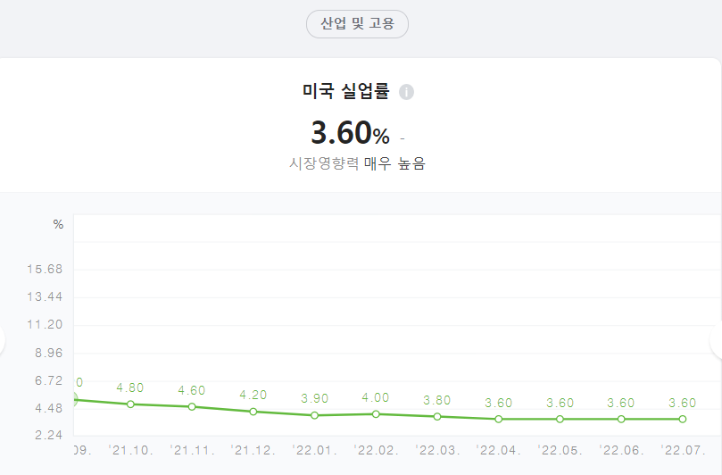 대출을 많이 받은 기업이나 자영업자들은 올라간 이자 부담에 소비까지 줄어드니 적자를 감수해야 하고 어쩔 수 없이 고용 인원을 해고할 수도 있다. 금리 인상은 실물경기에 굉장히 직격탄이지만 미국이 이렇게 금리 인상을 거침없이 하겠다고 예고하는 건 믿는 구석이 있다. 그건 바로 미국의 실업률이다.