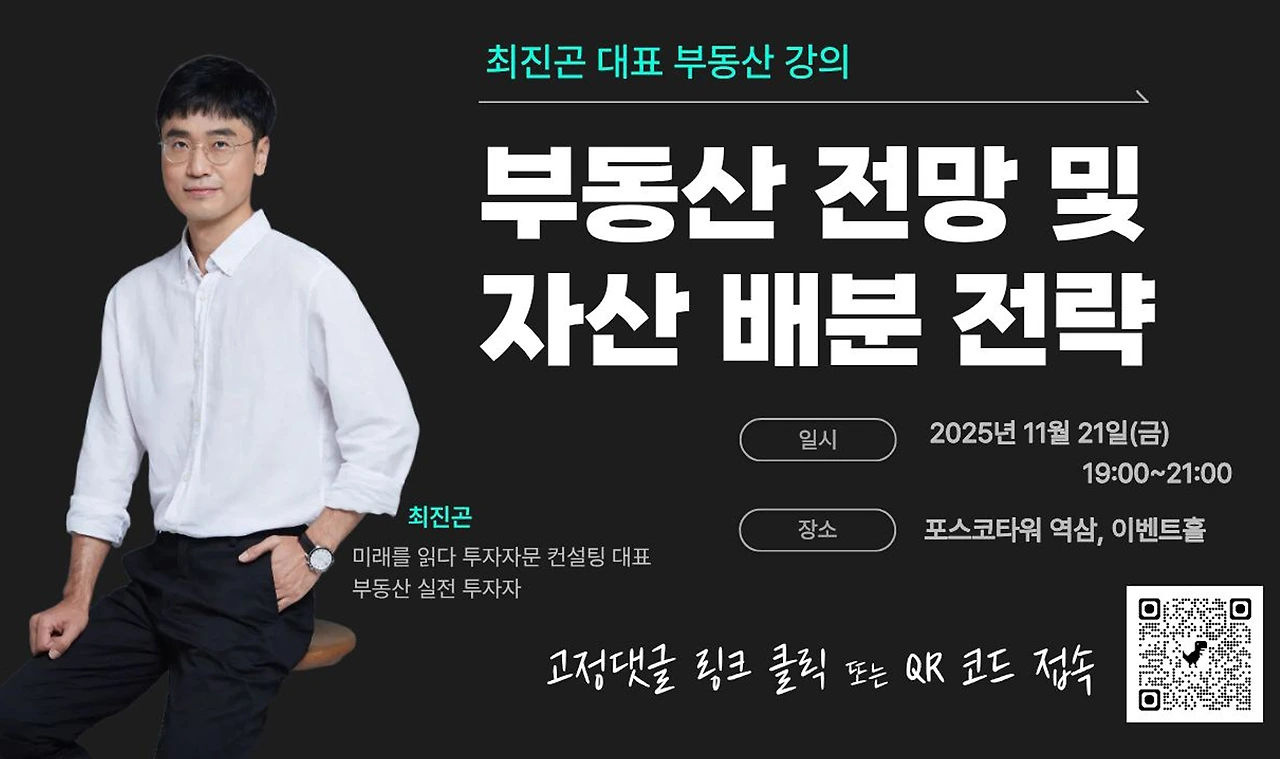 최진곤) 부동산 전망 및 자산 배분 전략 강의 �날짜: 2025년 11월 21일, 19:00~21:00 �장소: 포스코타워 역삼, 이벤트홀 �주제: 부동산 전망 및 투자전략 <1부> 부동산 전망 1) 현재 잠재된 리스크 2) 앞으로 나올 부동산 정책 3) 세계 경제와 우