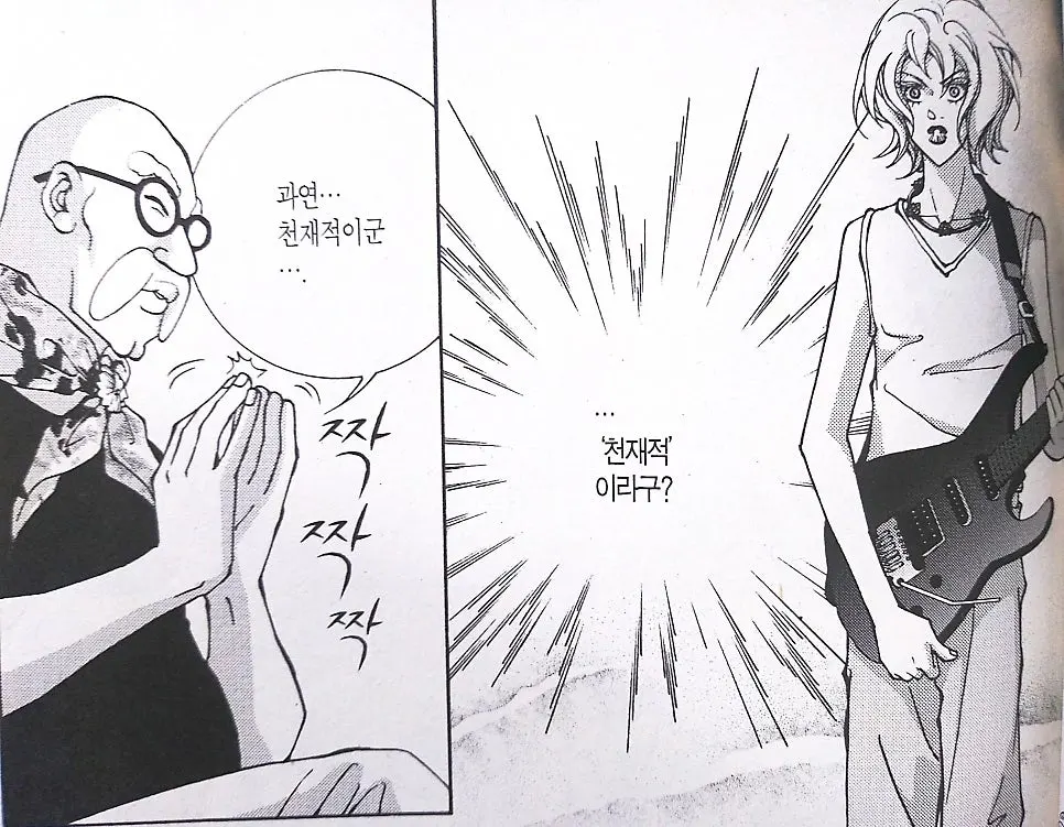 순서를 기다리느라 집어든 이 만화책이 생각보다 재미있는 건 함정이었다. 내용은 정확히 기억 안 나는데 대략 각 분야의 음악천재들만 모아서 밴드를 만든다는 내용이었던 것 같다. (「오디션」 팬 분들께는 심심한 사과의 말씀 올립니다) 유독 기억나는 한 장면이 있는데 바로 아래다.