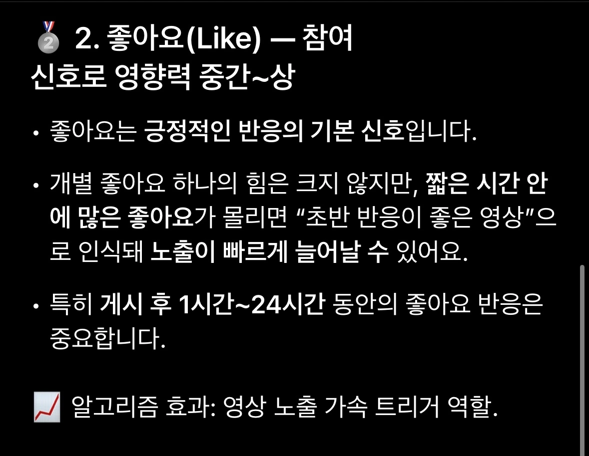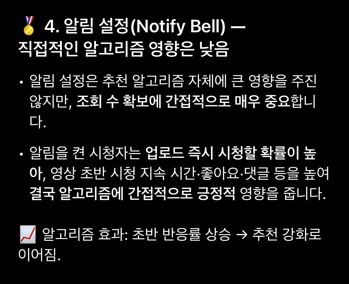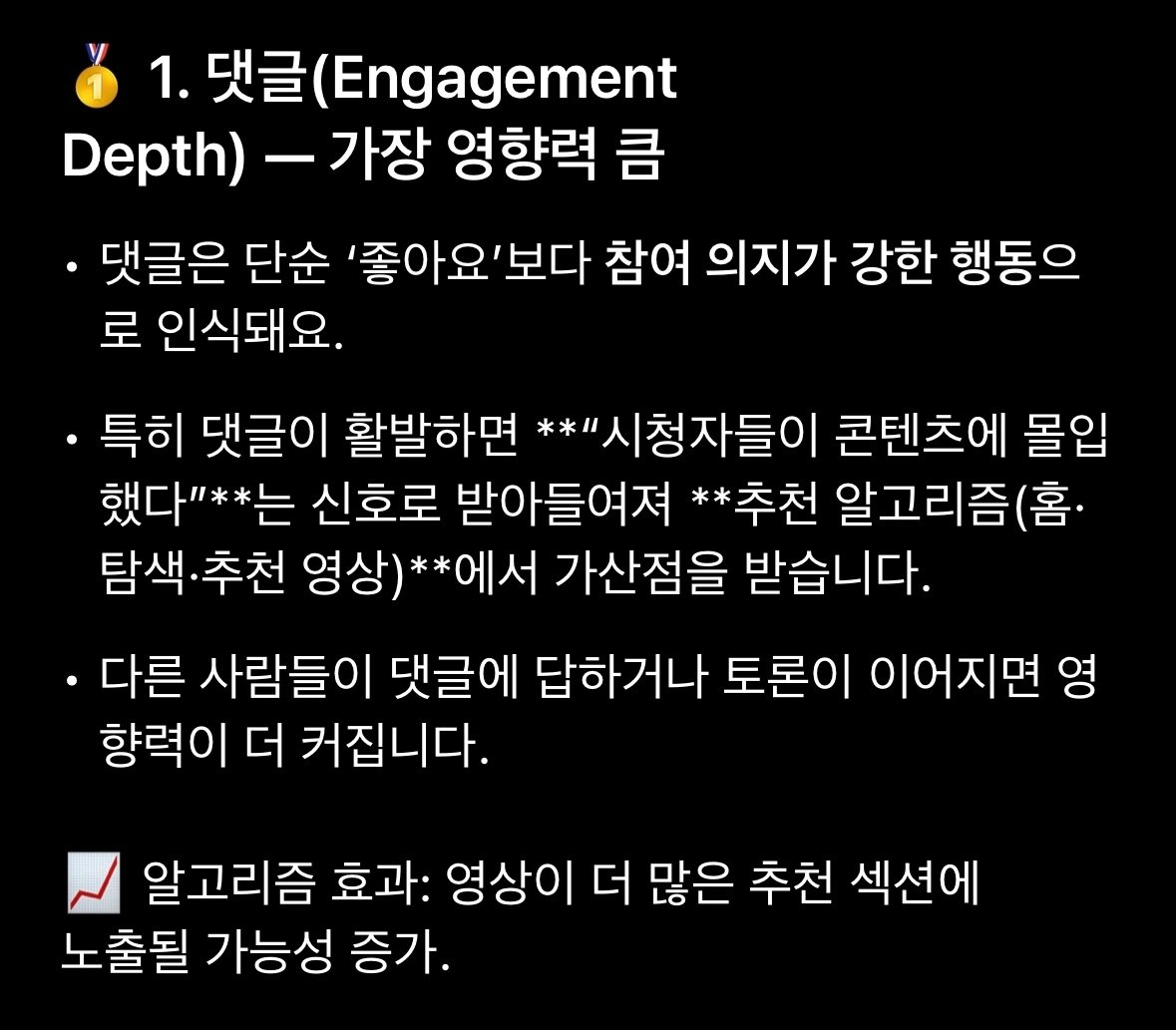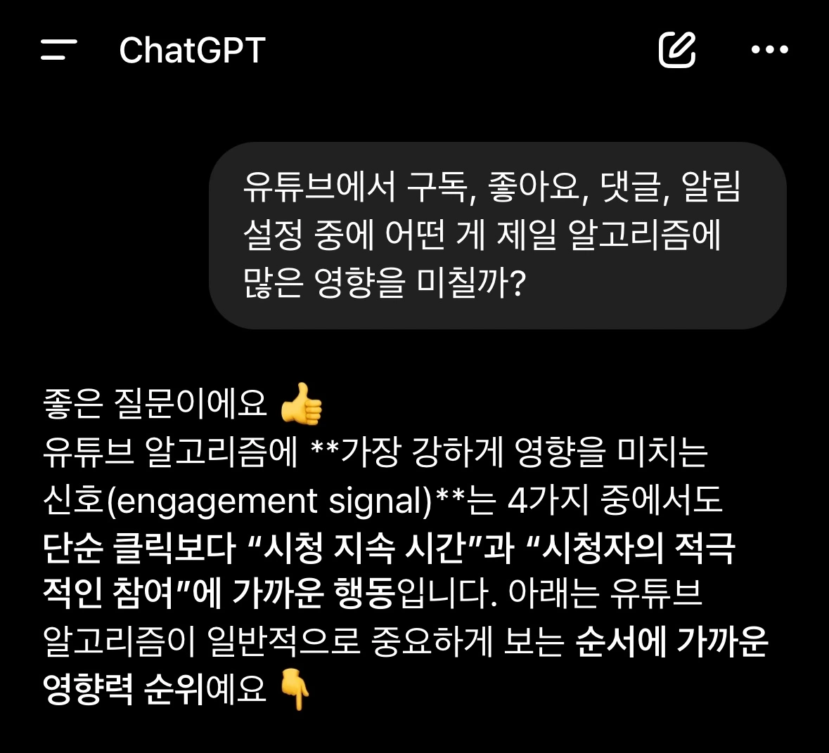 유튜브에서 주문처럼 요청받는 '구독, 좋아요, 댓글, 알림 설정' 중 어떤 것이 알고리즘에 가장 영향을 많이 미칠까. 다양한 이론들이 있지만 최근 권위자로 등극한 챗선생님께 여쭤보기로 한다.